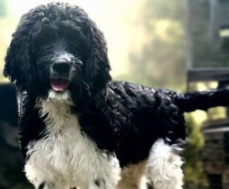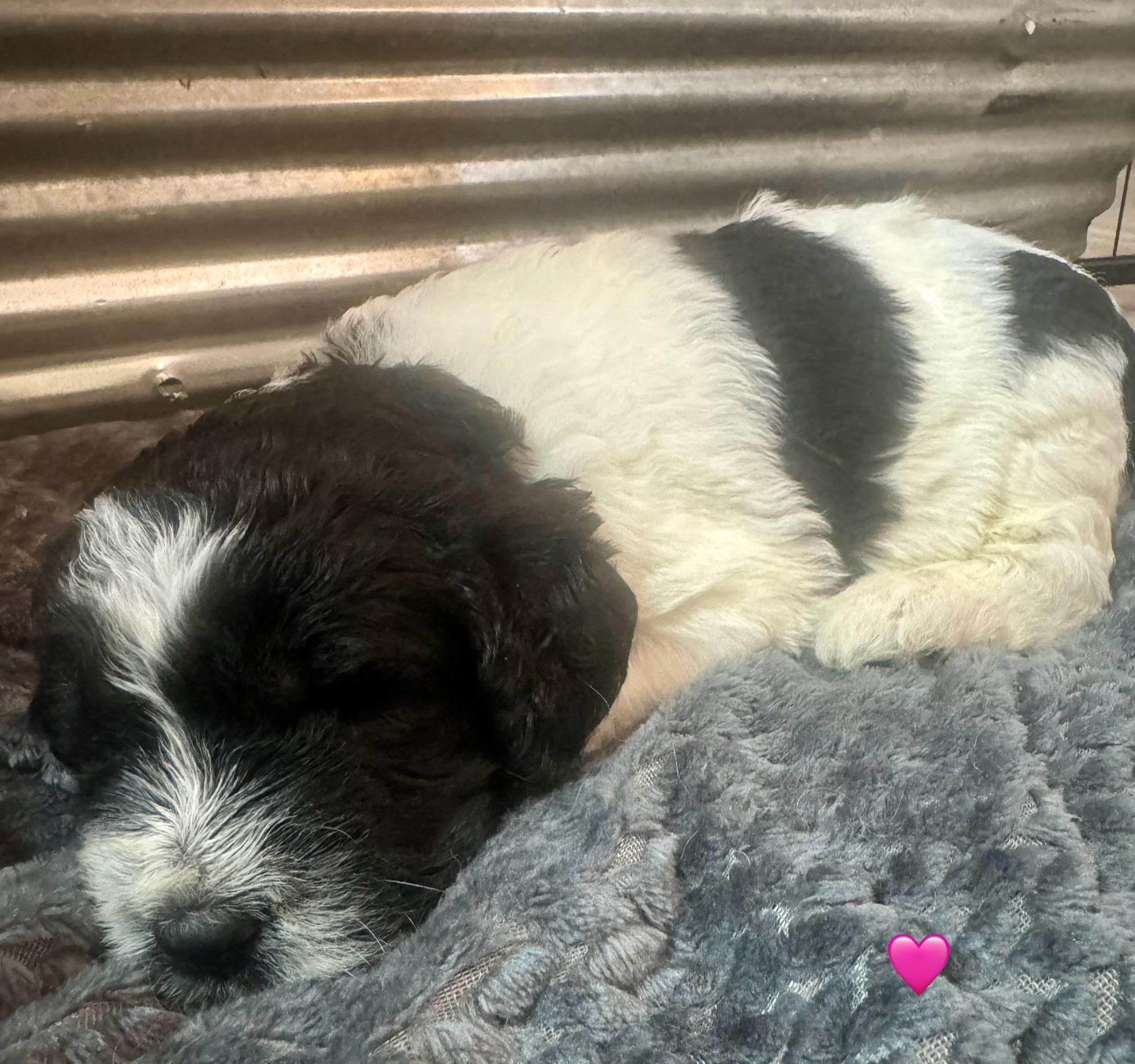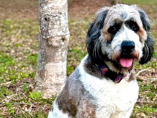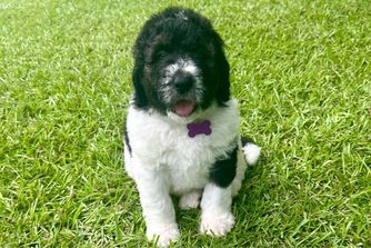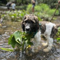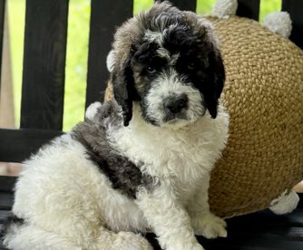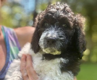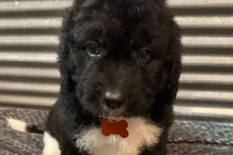Momma, Finley, is a 90lb F1 Saint Berdoodle. She lives in the home with her family, including a 1 and 3 year old. She is a gentle giant and has helped both of her human children to learn to stand by being a statue or walk by holding on to her and gently leading them. She is extremely loyal, human focused and low energy.