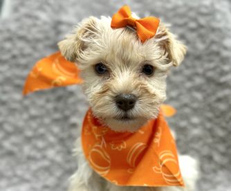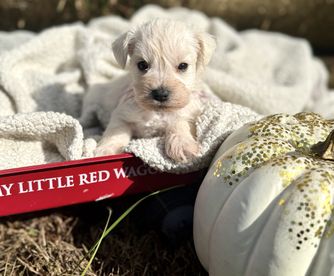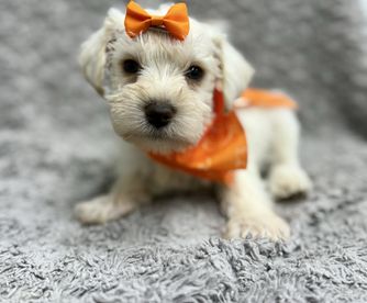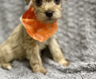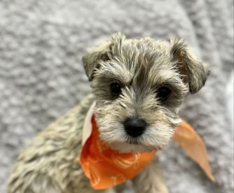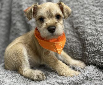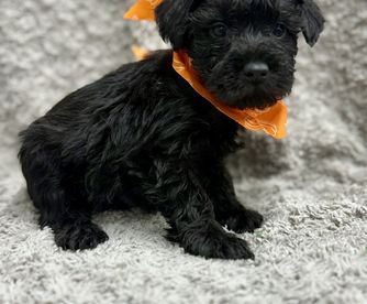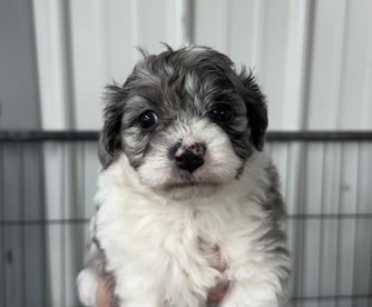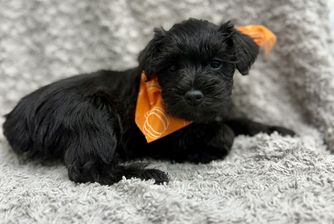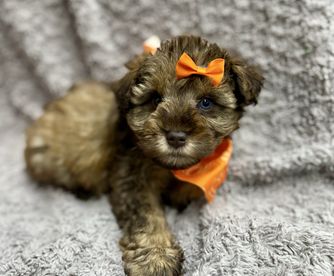Our Aussiedoodle puppies include blue merle, red merle, and black and white. Schnoodle puppies include merle, brown, black and tan, apricot, and sable. Miniature Schnauzer puppies include wheaten, white, parti, liver, and salt and pepper. Colors will vary depending on the parent dogs.