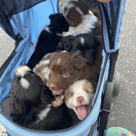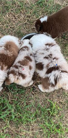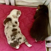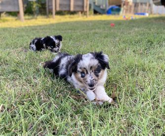 Our Miniature American Shepherd puppies include black & white, red & white, red tri-color, black tri, red merle, and blue merle. Miniature Australian Shepherd puppies include red & white, black & white, blue merle, black tri, red tri, and red merle. Toy Australian Shepherd puppies include red & white, black & white, red, black tri, blue merle, red merle, and red tri. Colors will vary depending on the parent dogs.