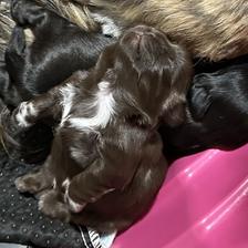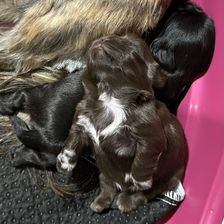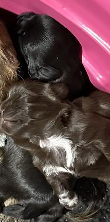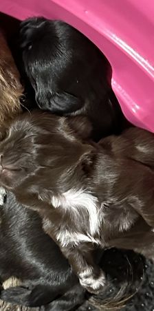 Our puppies include liver, brindle and white, liver and white, gold and white, and black and white. Colors will vary depending on the parent dogs.