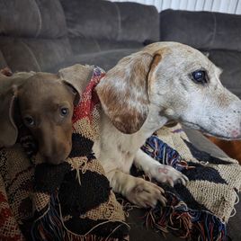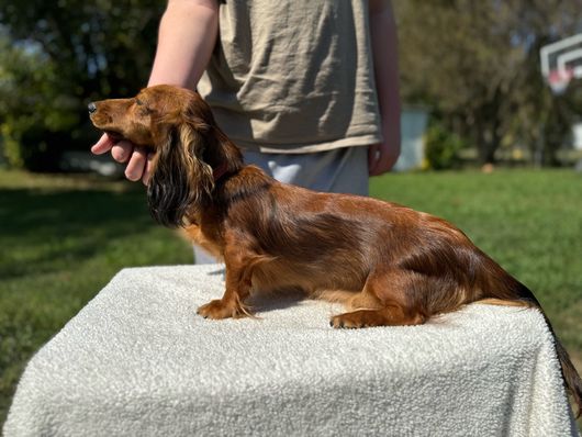 Ashley was quick to respond when we inquired about a puppy on the Good Dog website. The overall process of bringing the pup we selected was straight forward and easy. We have been very happy with our Dachshund puppy we call 'Rose'. She fit right in with our family and our 5 year old Dachshund 'Belle'. We had never seen Belle play much when she was a puppy. She was raised with a 10 year old German Shorthair who at best was tolerant. Now, with Rose, we see the real personality of Belle. Rose and Belle are like litter-mates sometimes and mom and daughter at others. Rose is growing like a weed as you can see in the attached photos. From the beginning, Rose was well adjusted, bold, and inquisitive indicating the superior breeding environment provided at Southern Sky Dachshunds and Ashley. I cannot recommend Ashley highly enough.