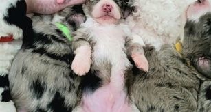 Our puppies include blue merle, red merle, black phantom, black and white, and black tri-color. Colors will vary depending on the parent dogs.
