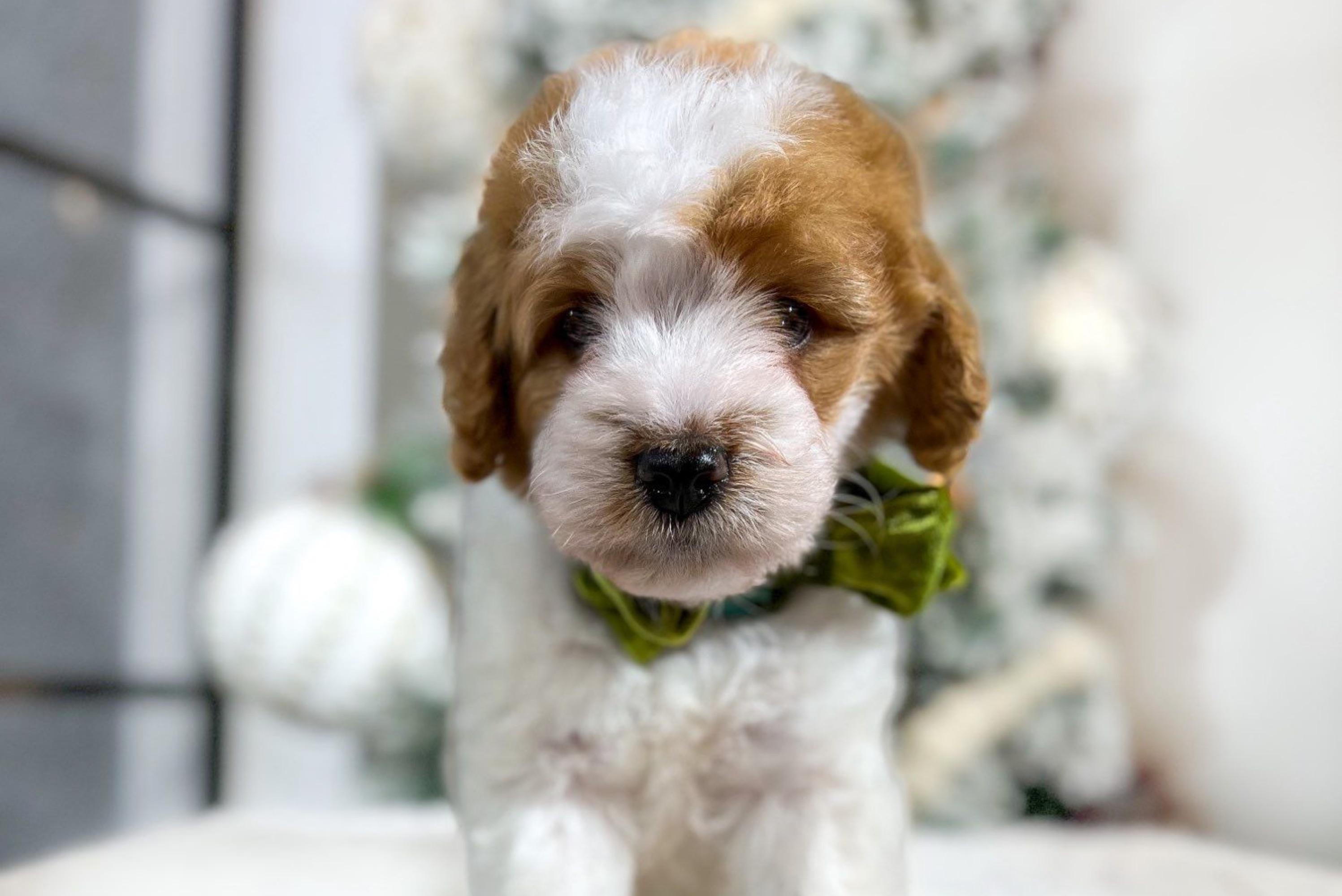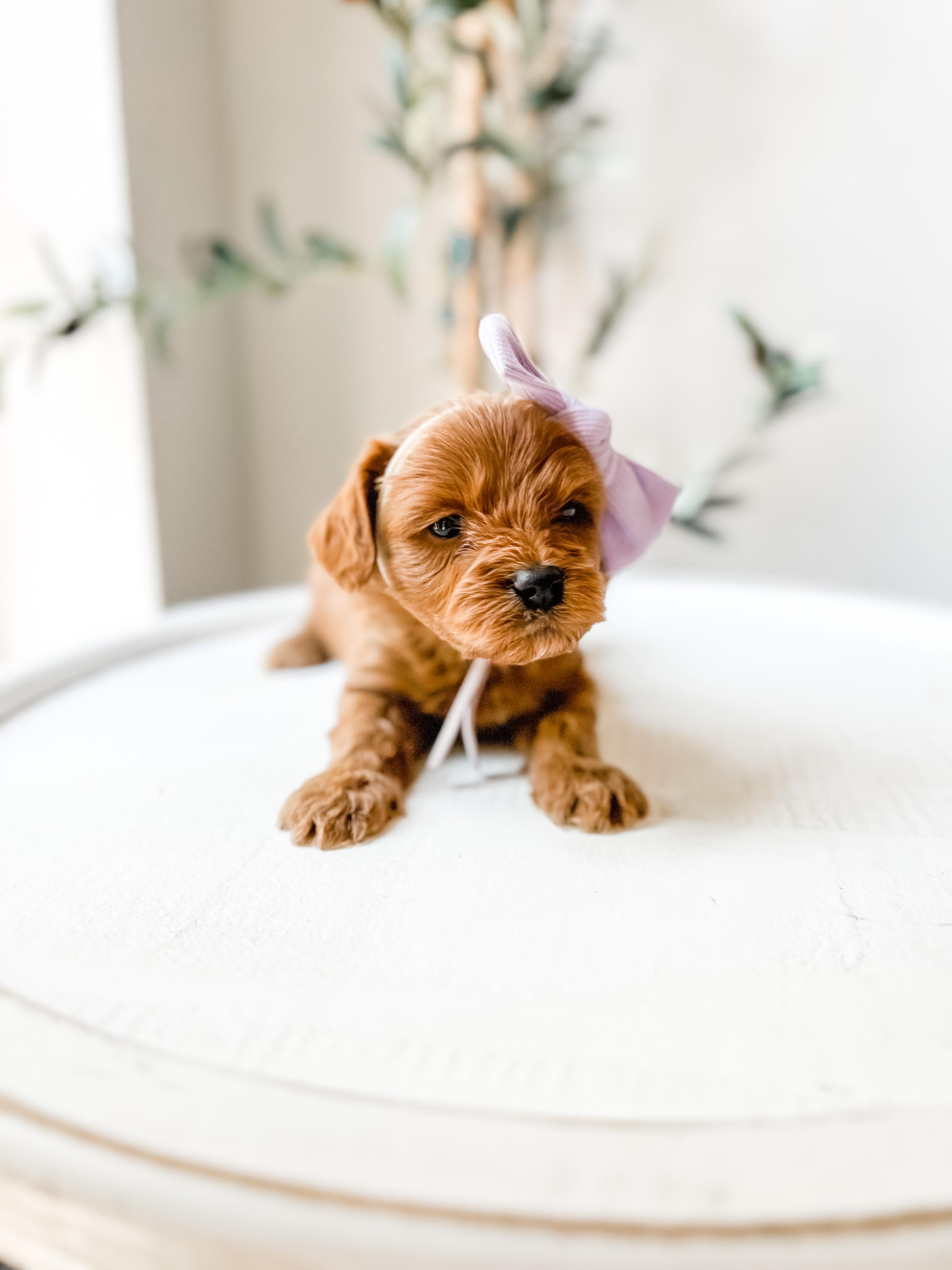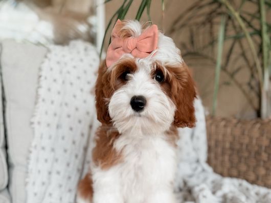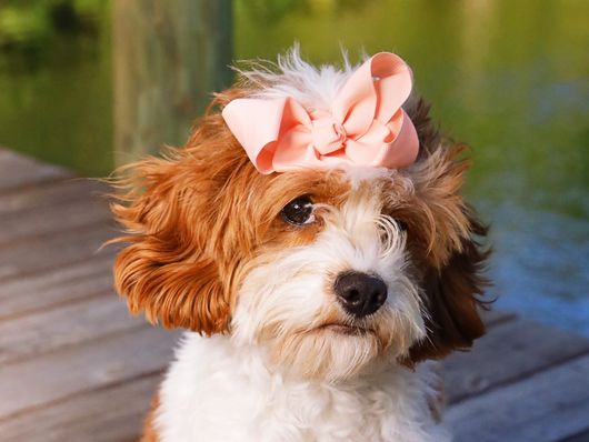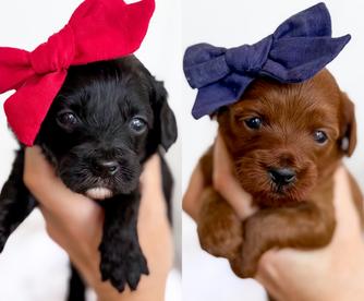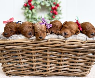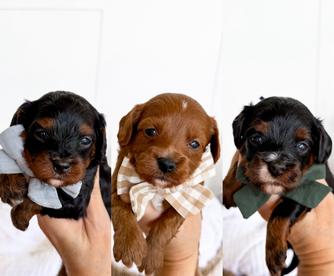 Our Goldendoodle puppies include cream, apricot, red, chocolate, black, phantom, and parti. Cavapoo puppies include black and white, tri-color, red, and blenheim. Colors will vary depending on the parent dogs.