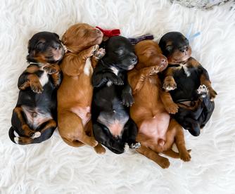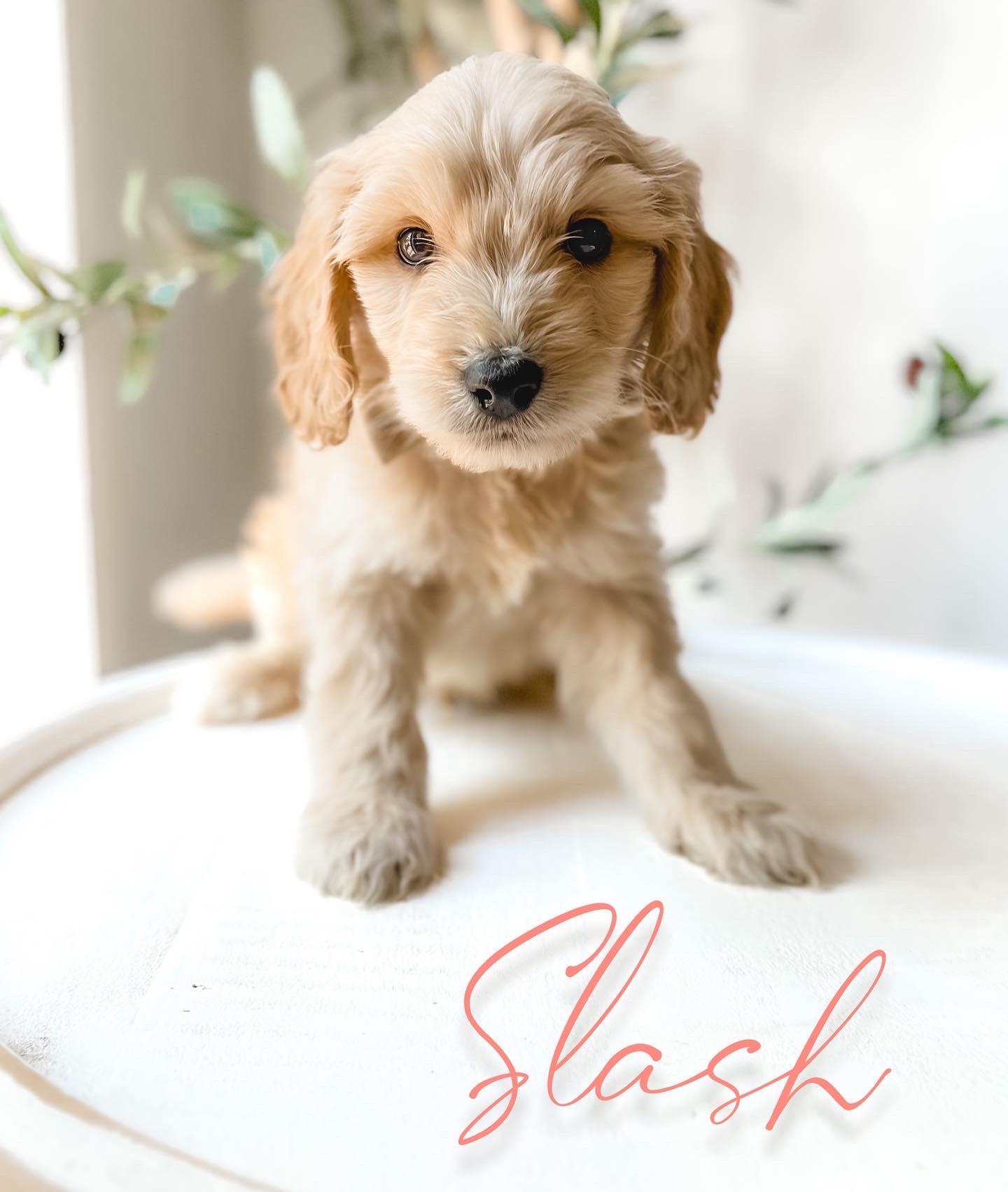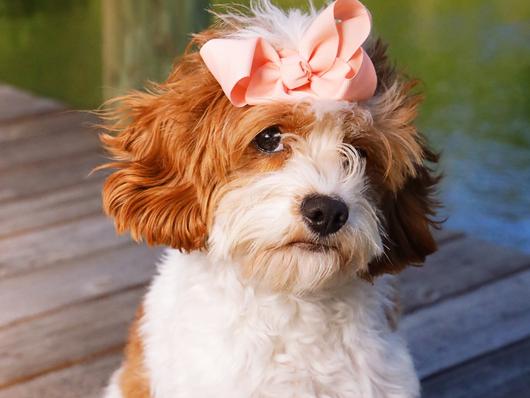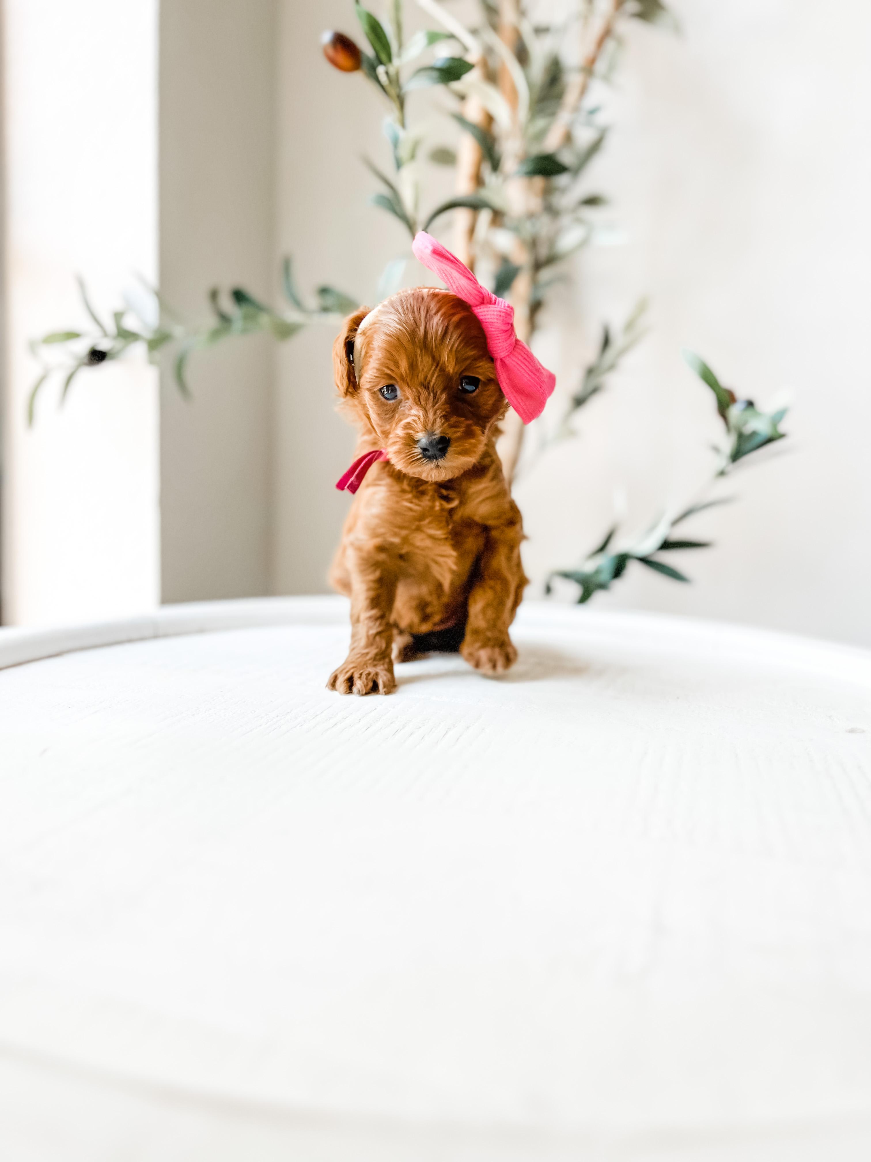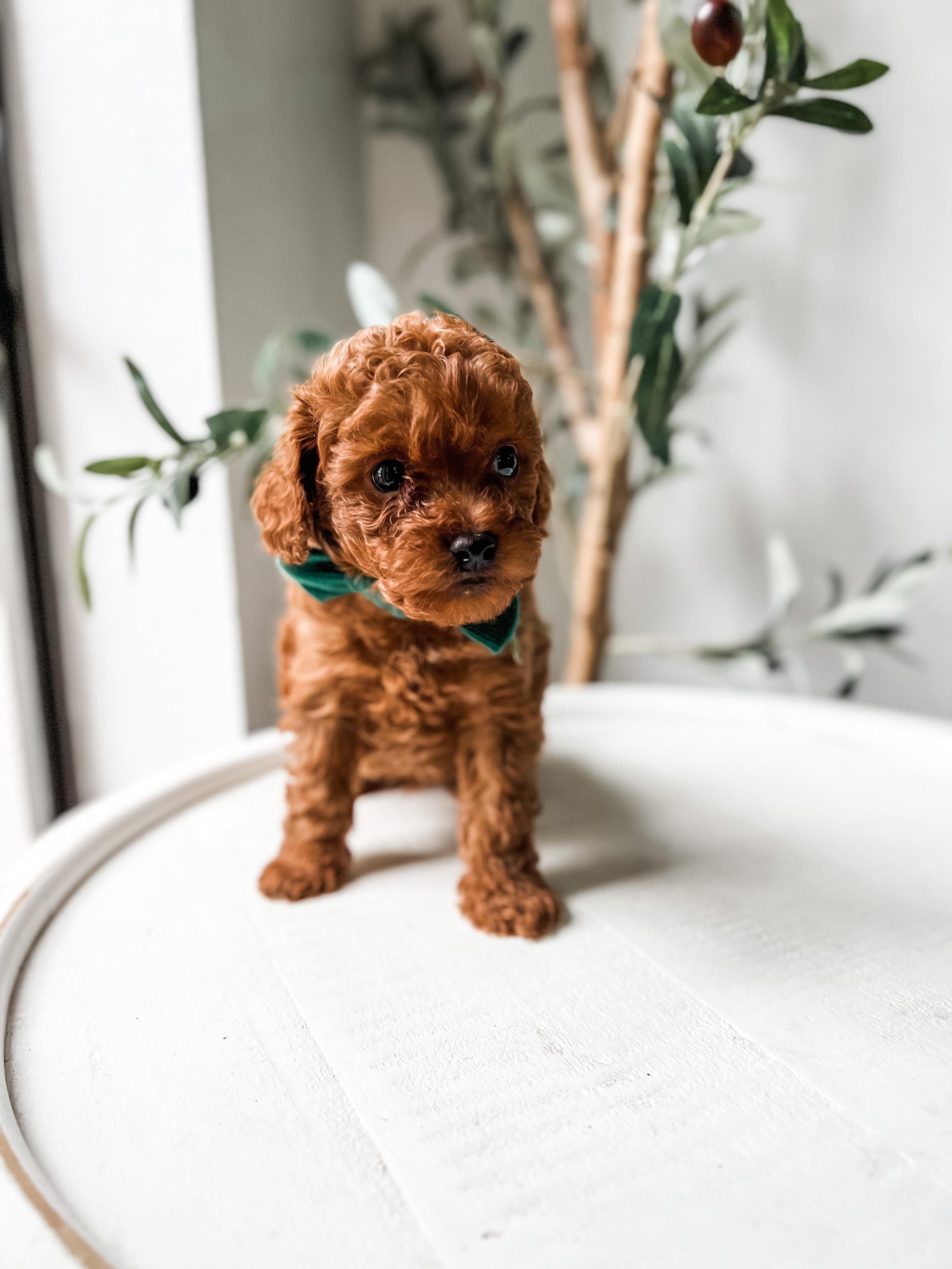 Our Goldendoodle puppies include cream, apricot, red, chocolate, black, phantom, and parti. Cavapoo puppies include black and white, tri-color, red, and blenheim. Colors will vary depending on the parent dogs.