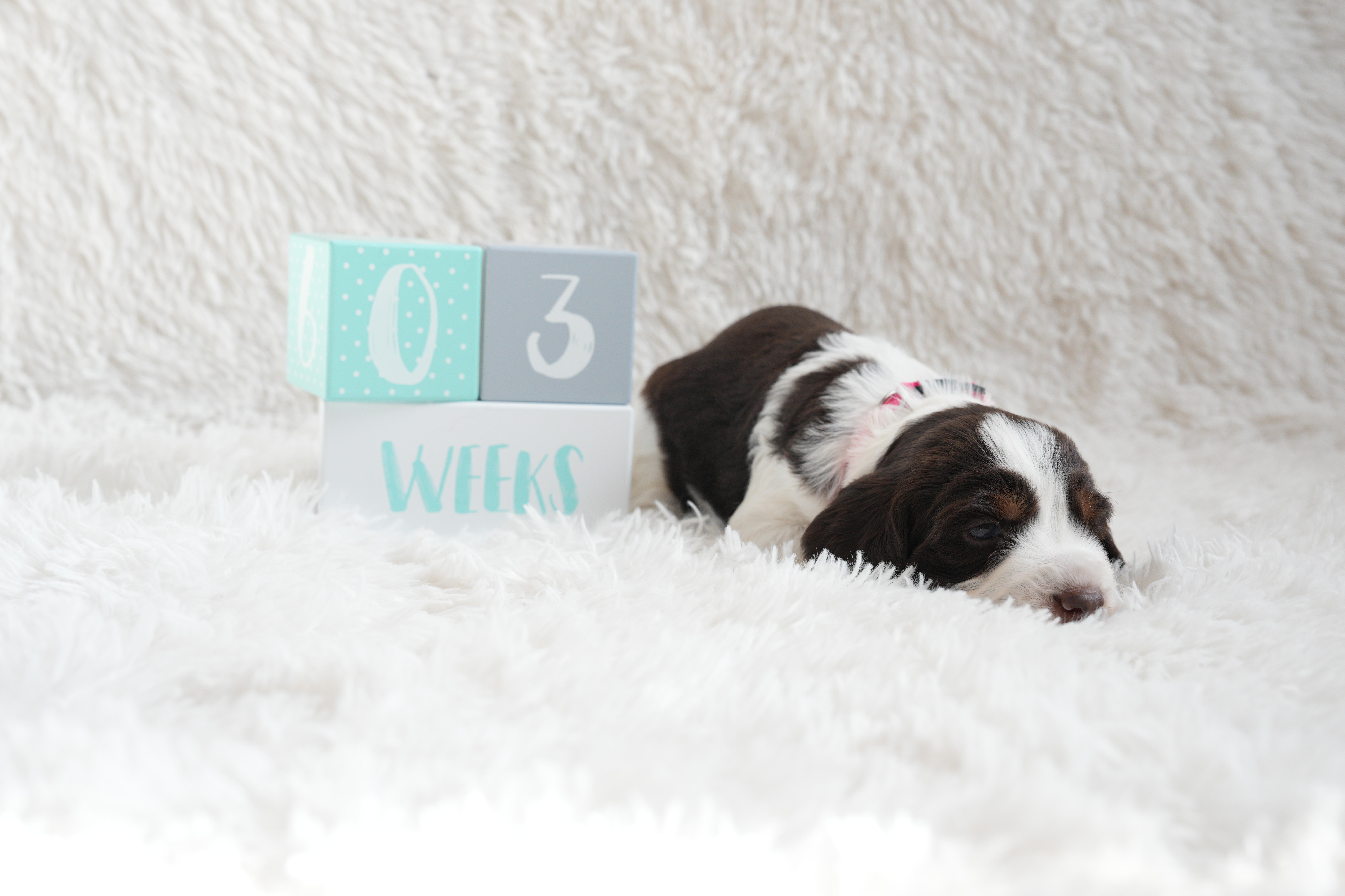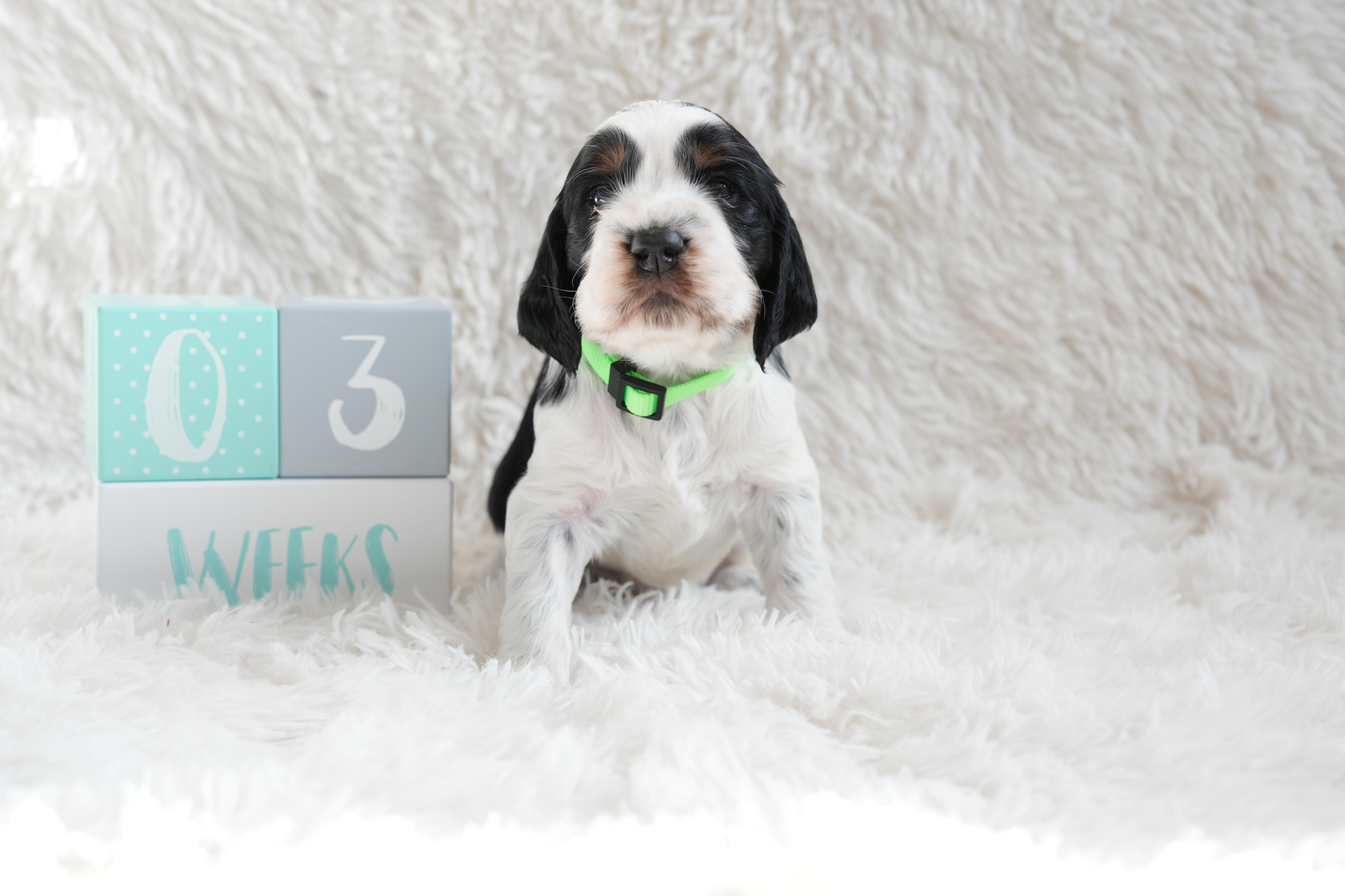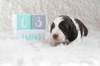 Our puppies include liver white and tan, liver and white, black white and tan, and black and white. Colors will vary depending on the parent dogs.