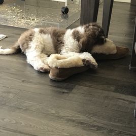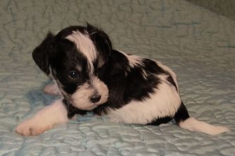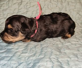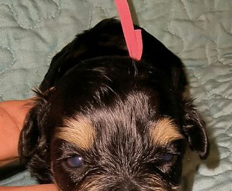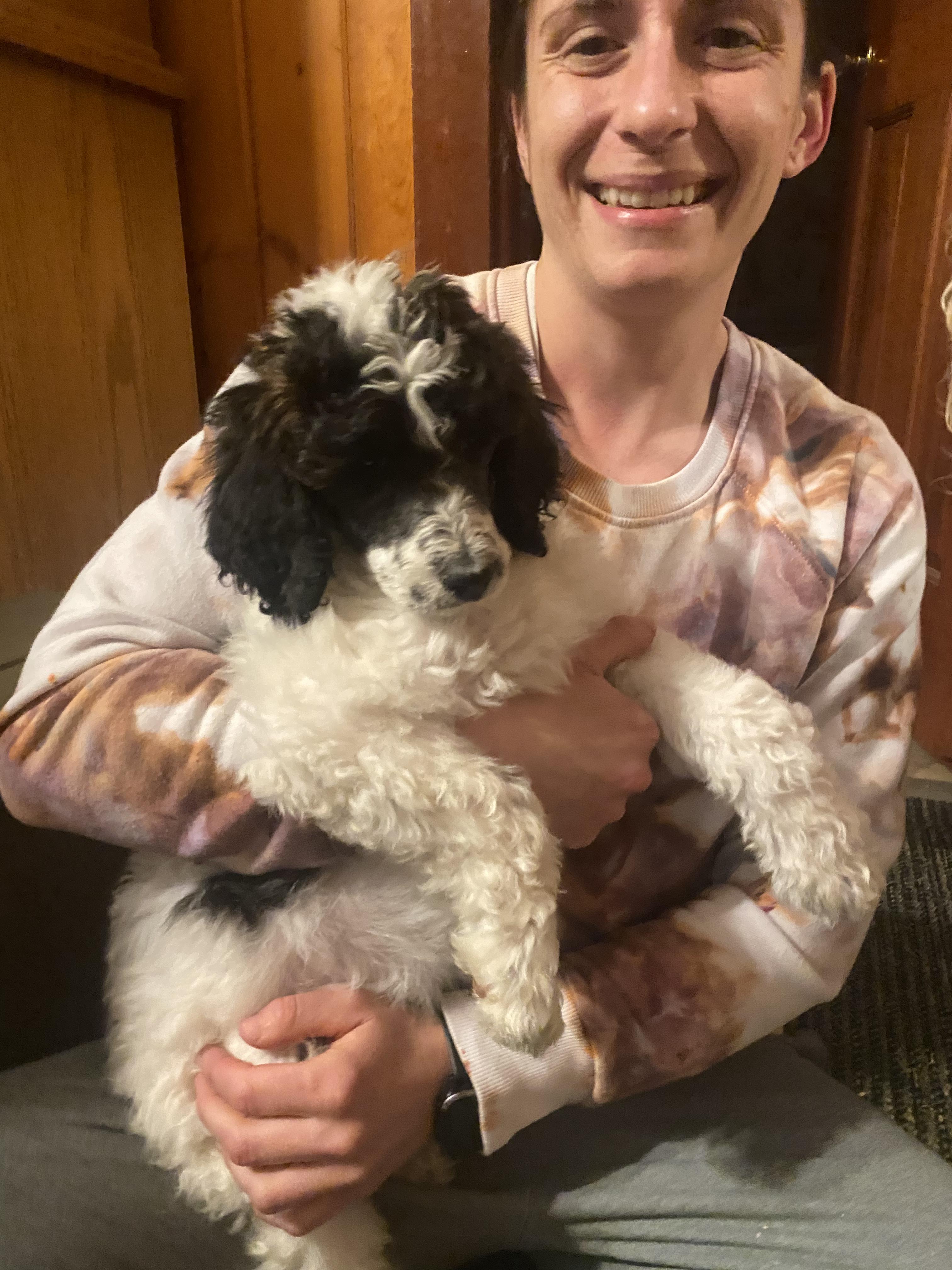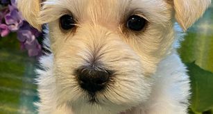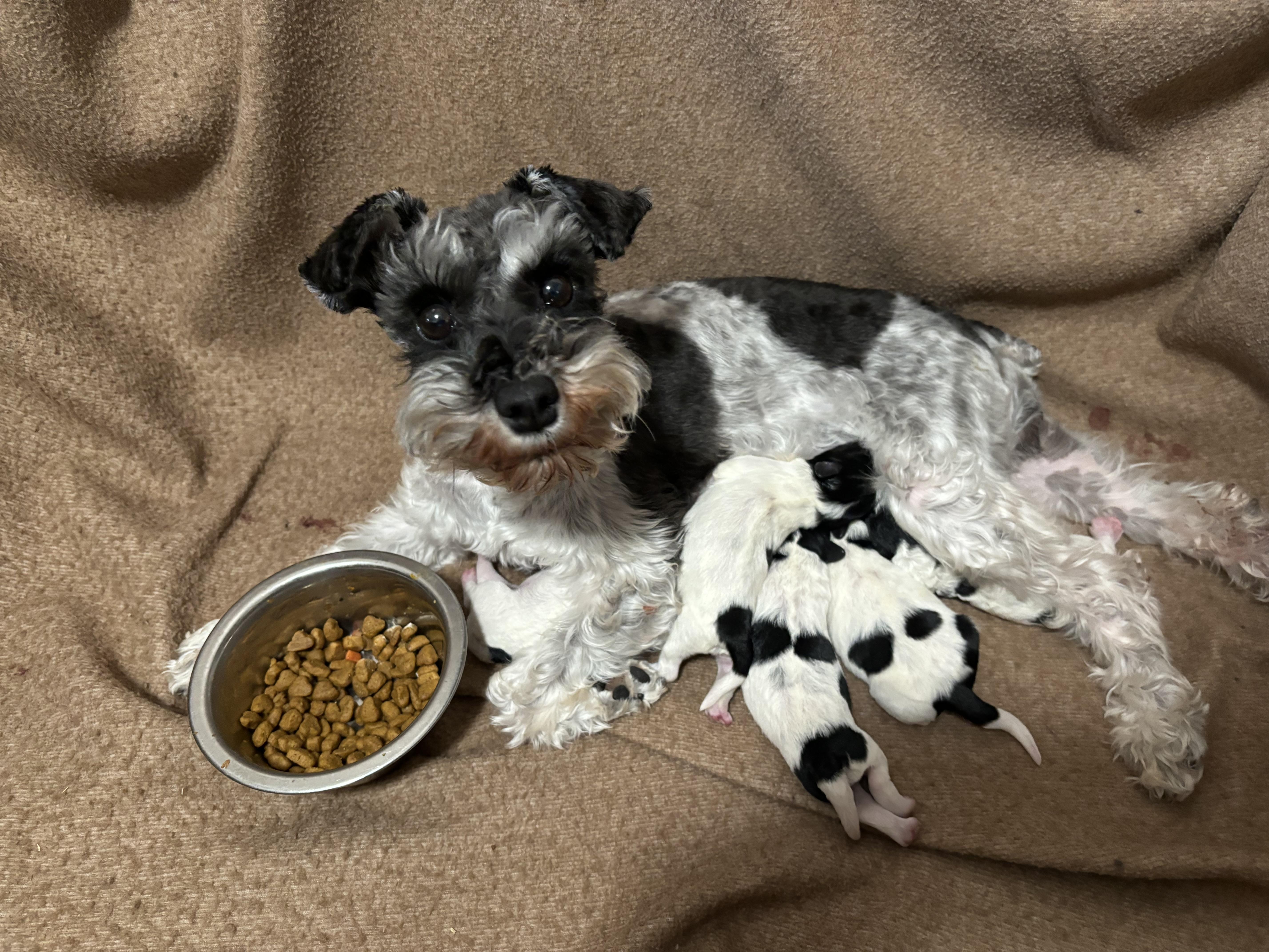 Windom is a sweet girl and has 5 beautiful Schnoodle babies! they are white with black spots and speckles. So much fun! we have done health testing on the parents do early neural stimulation training of the puppies, potty training and play training. They will go home early Feb.