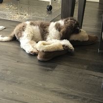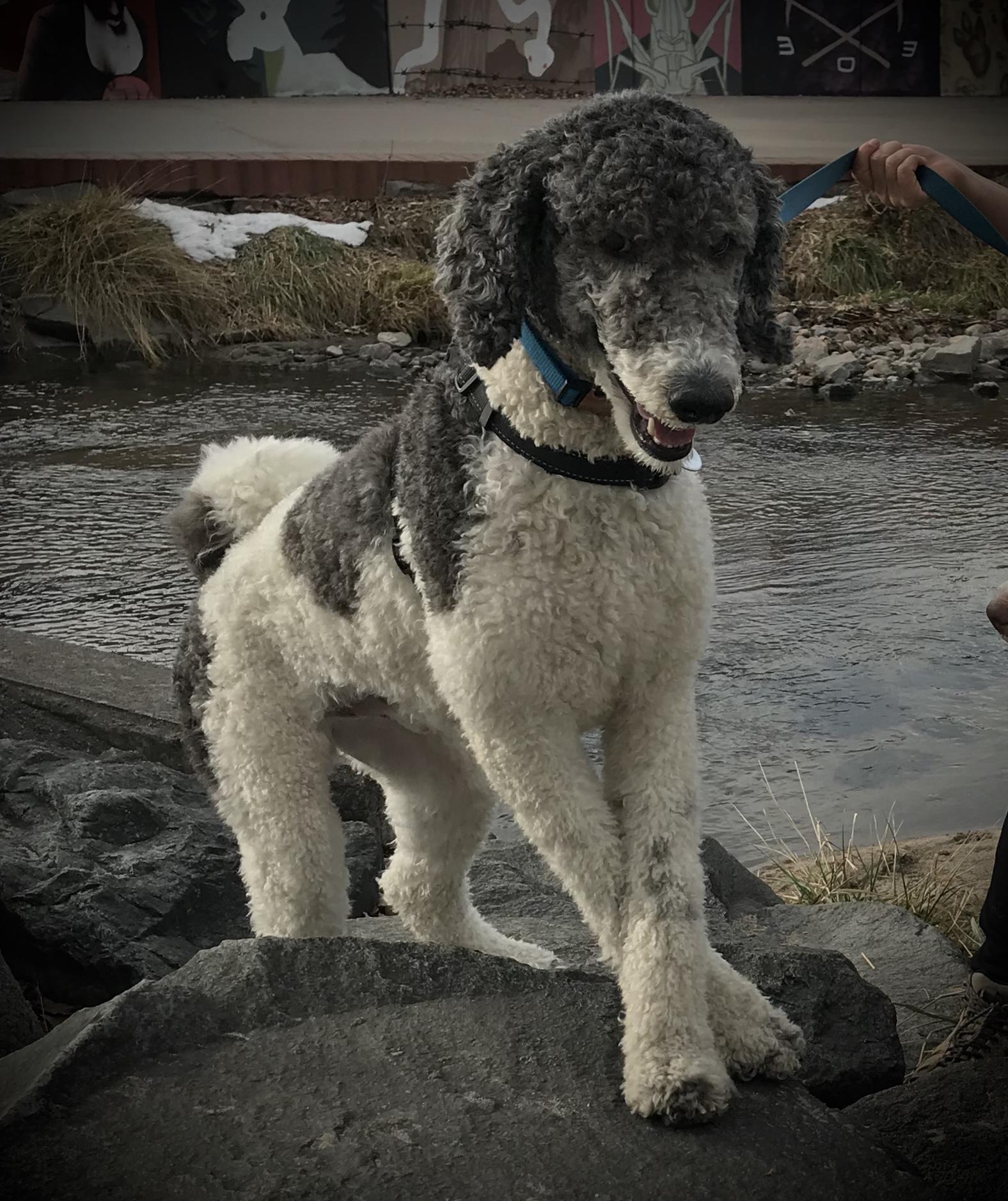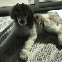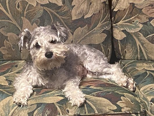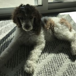 Beatrix is a gorgeous white and brown spotted parti schnauzer with a mega coat. She is a sweetheart, and very devoted to her family. She is very smart.
