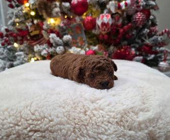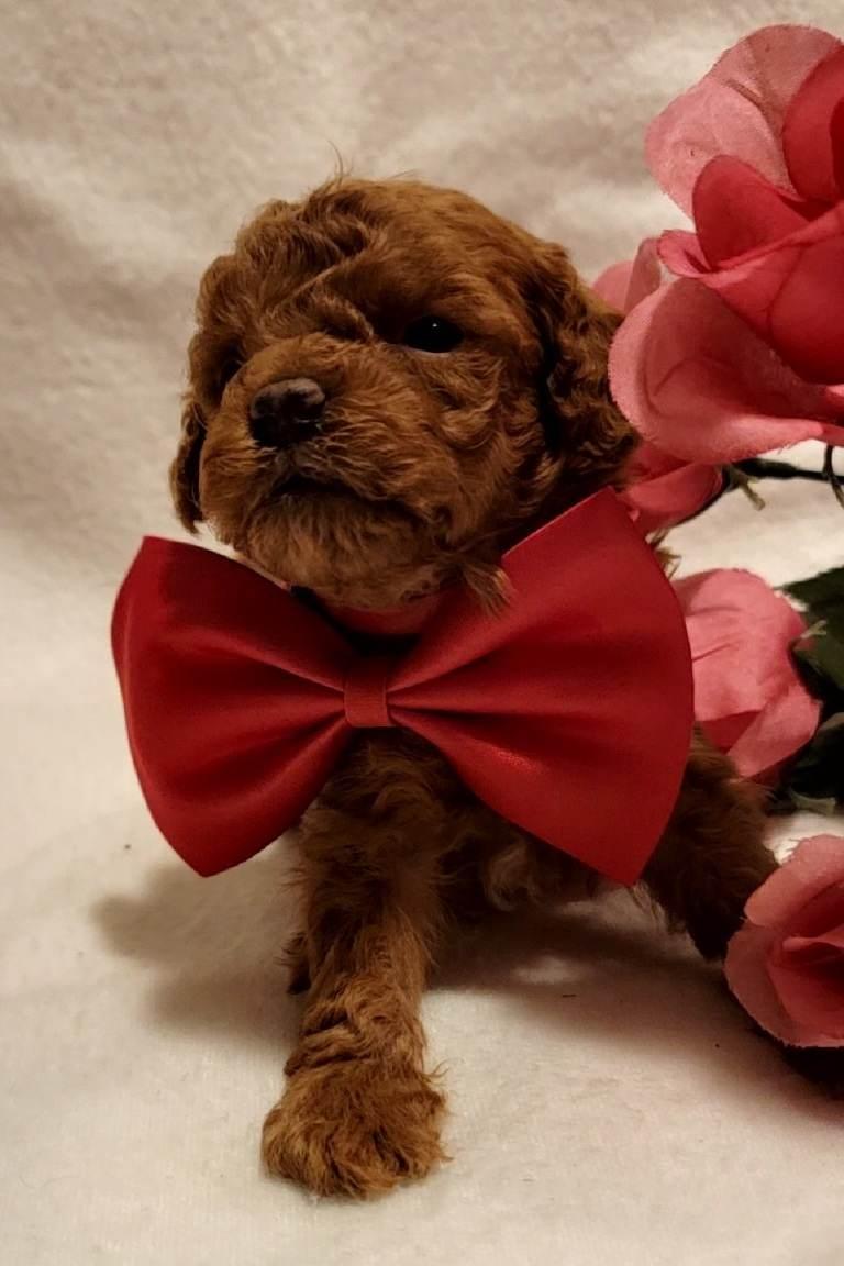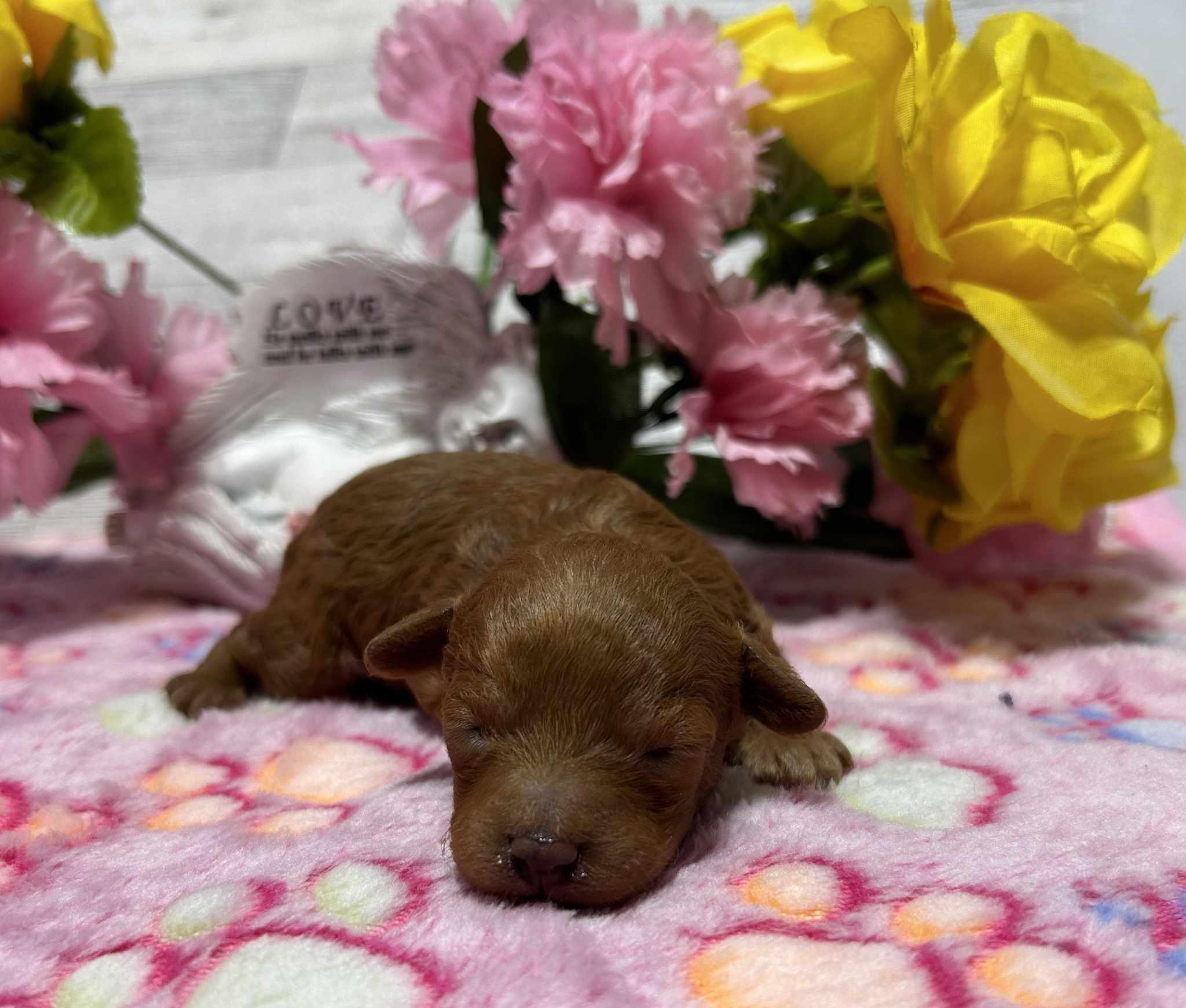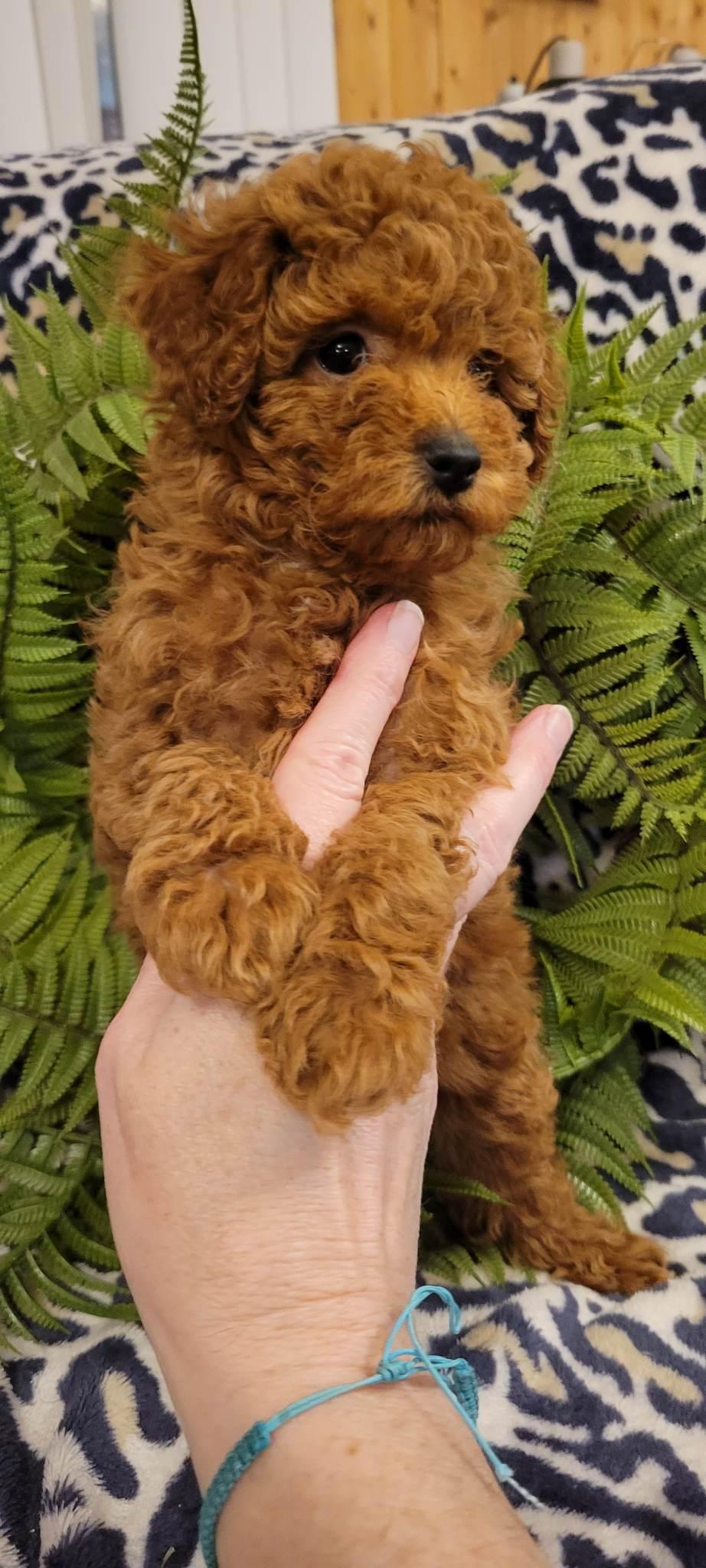 Fireman is a precious tiny tiny boy who still looks like a puppy. He has the sweetest loving personality and prances as he walks like he is king of the world. He is a beautiful dark red and produces tiny pups