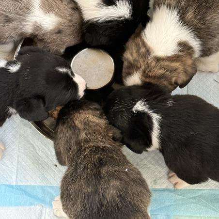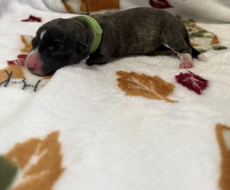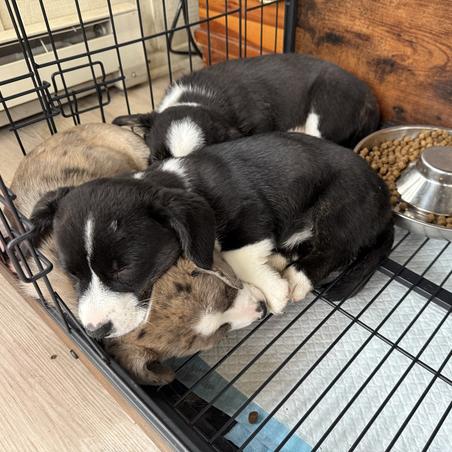 Our puppies include brindle merle and white, brindle and white, and blue merle and white. Colors will vary depending on the parent dogs.