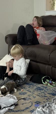 Luna is triple OFA certified- elbows, hips, and eyes! We have genetically tested for DM, EIC, PRA, SCID, and VwD with clear lineage. We will not introduce any genetic carriers to increase outcomes for longevity and health for all our puppies. Puppies are handled daily by our children and exposed to the other animals in the home. We also take puppies (safely) into public for socialization.