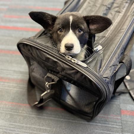 Snickers looks not so sure about flying, but that’s why we like to flight nanny ourselves. Just a quick hop skip jump and she’ll be on the east coast!