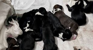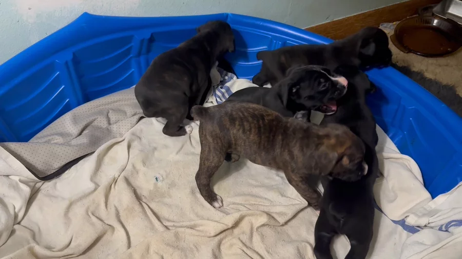 These beautiful babies have learned how to climb out of the kiddie pool next to me in the bedroom so they've have upgraded into the larger more spacious whelping box in the living room. They can't climb out of it unless we leave the door open. They are smart, enjoy pets & absolutely love being talked to.