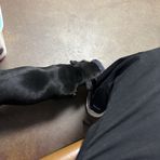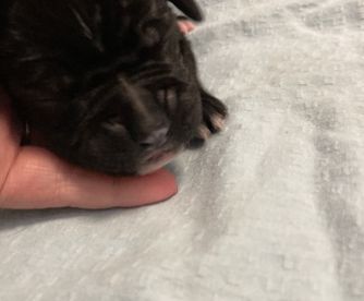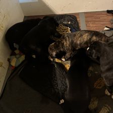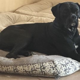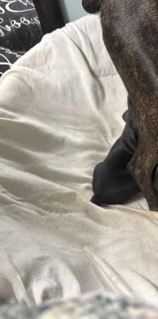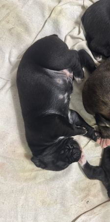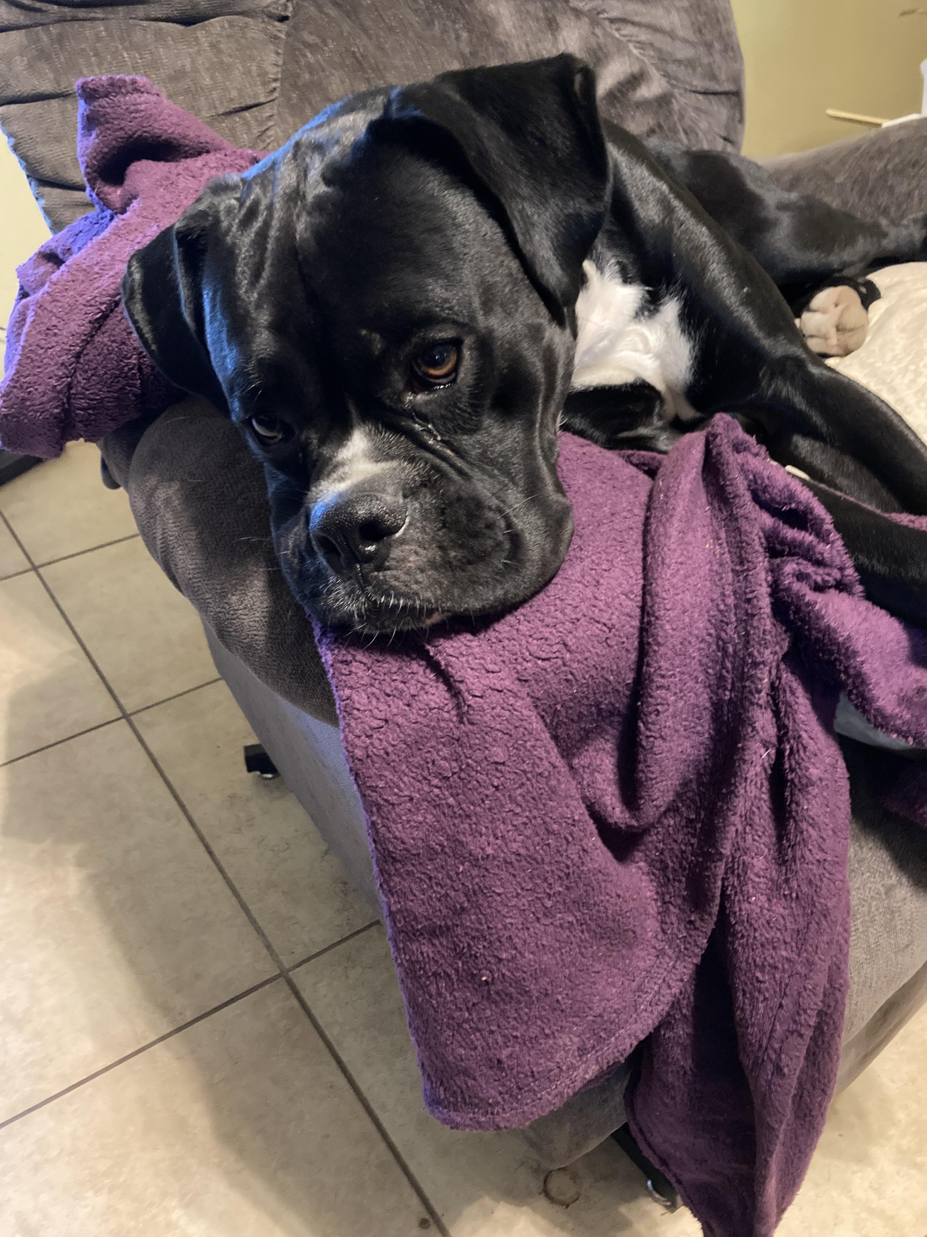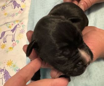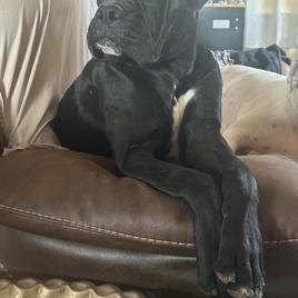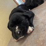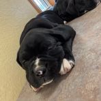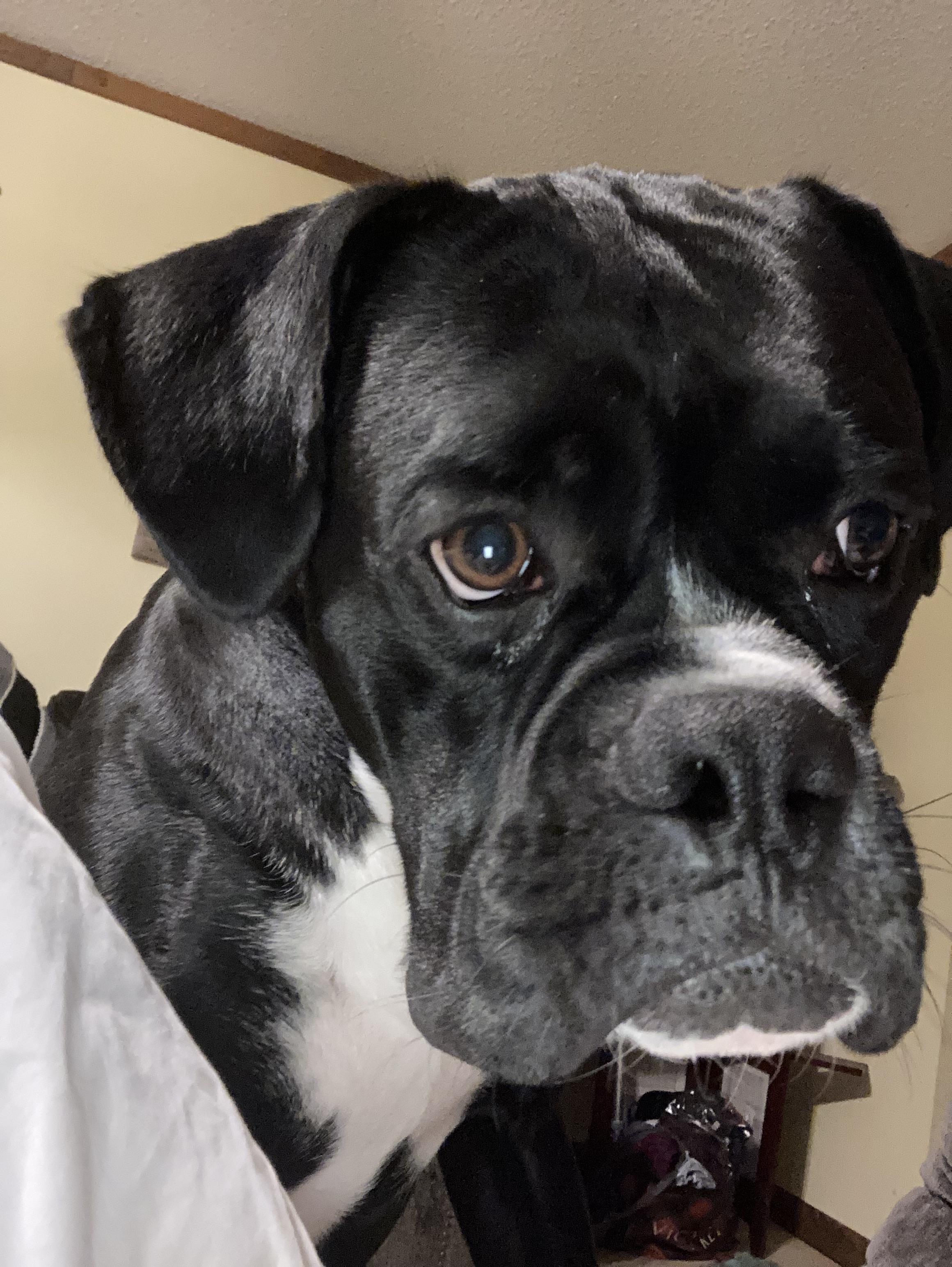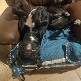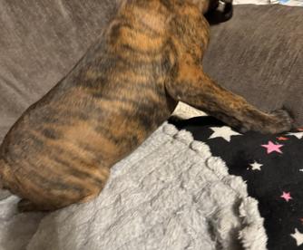 Delta is a reverse brindle, she is 100% euro, she has big paws to go with her smooshy face. She is very calm, very loving and enjoys cooler temps. Such a sweetheart.
