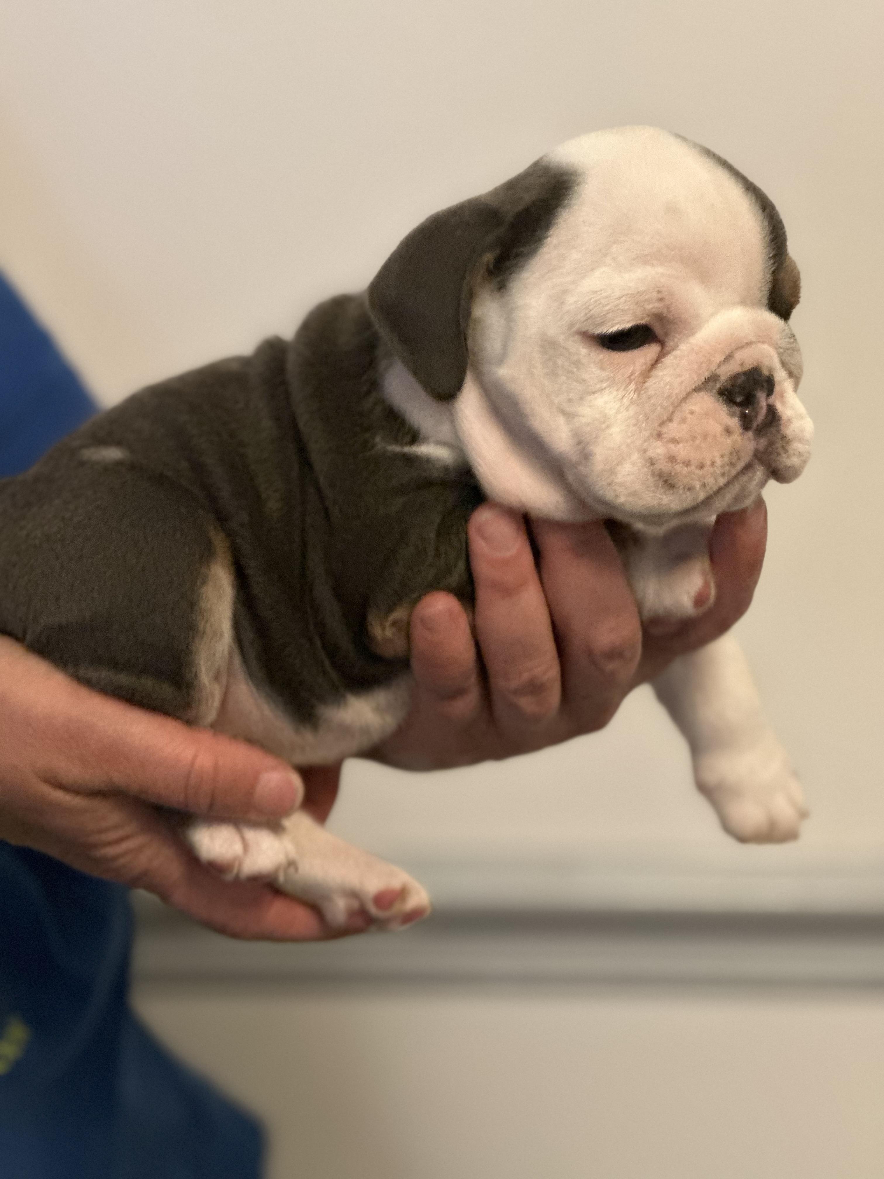 Stormy is from Gertty’s retirement litter and is her twin! Stormy is may look like your typical bulldog but she is full of energy and fun! She has been heath tested and cleared! She is a blue tri and with the right stud can produce the rainbow. Her first breeding is estimated to be summer of 2024 and we plan to bred her with in house stud Maserati.