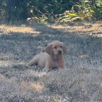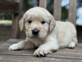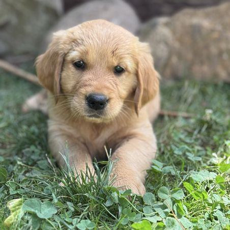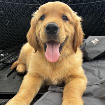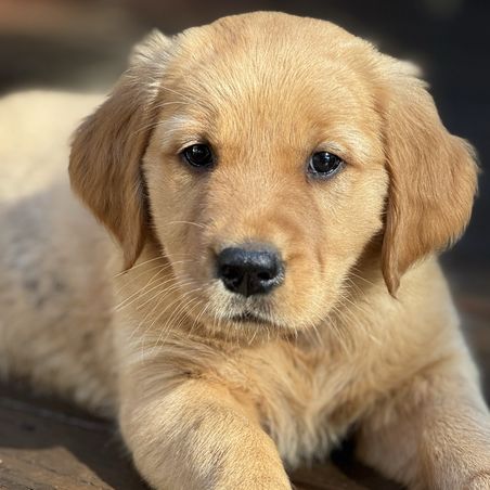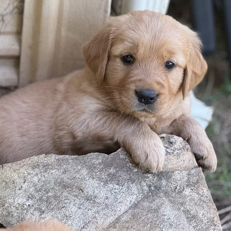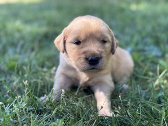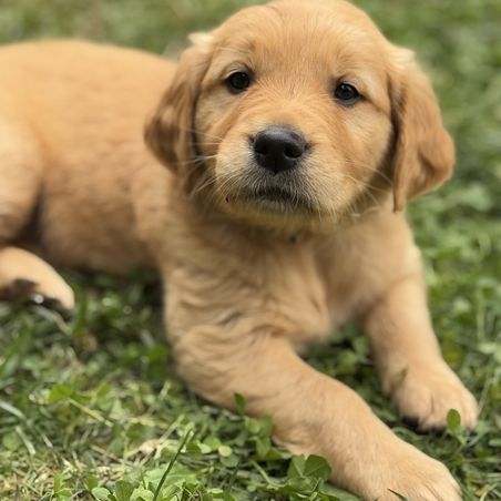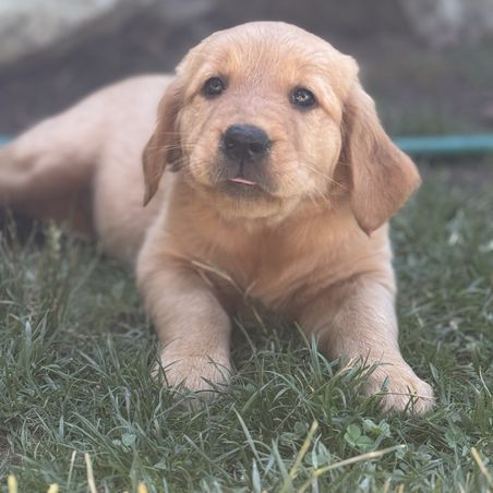 Ellie is a sweet girl, who is very intelligent, energetic, and playful. She loves to spend her days swimming, going for walks, hanging out doing farm chores with her family, and chasing 4 wheelers. She is a beautiful golden girl, she is AKC, DNA, and OFA eyes, heart, hips and elbows.