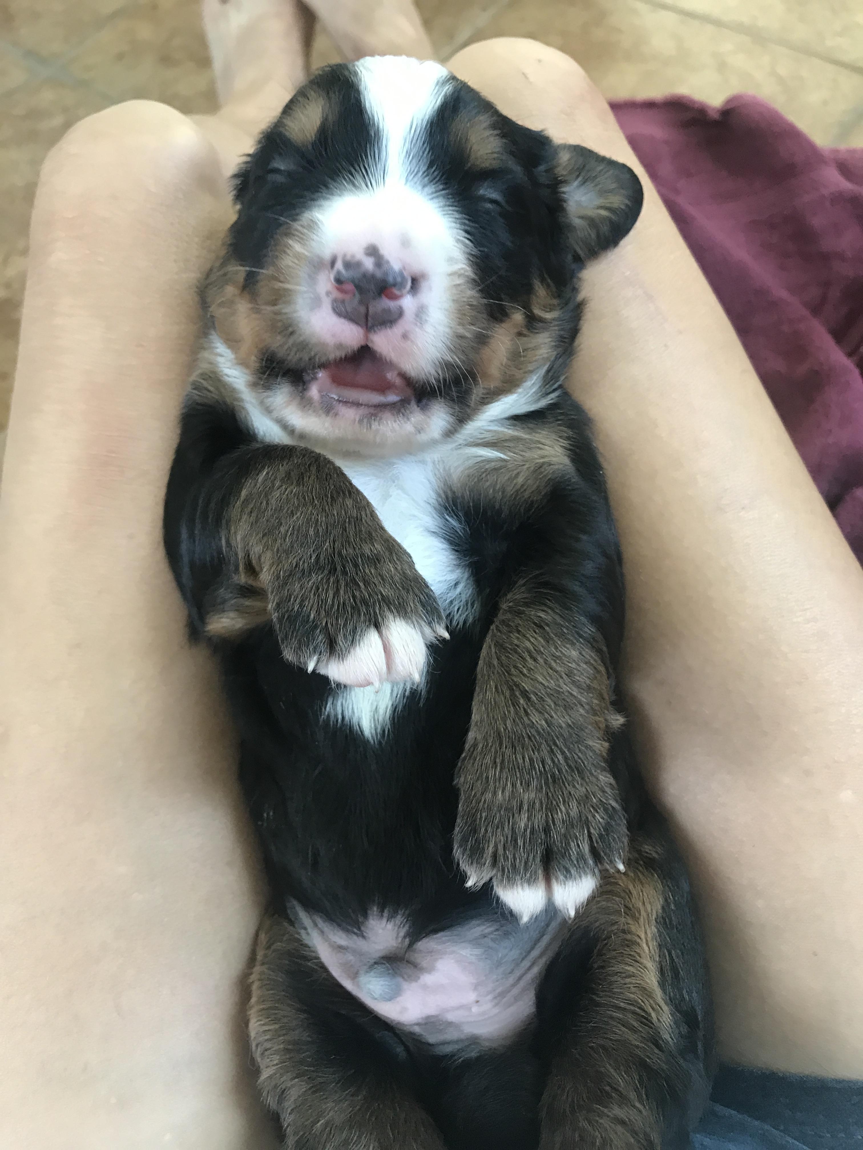 Aria is a female Bernese Mountain Dog. Carefully selected as a great representative of her breed, Bonita decided to make her part of their program. Bonita has passed Good Dog’s screening process, which involved a review of their breeding practices, environment, and the mental and physical health of their dogs.