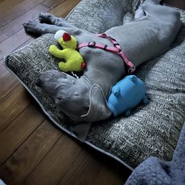 Celeste is such a sweet girl! She is a shadow dog and absolutely loves to be with our kids. You’ll always find her touching somebody and making sure she’s part of the action. Color wise, her color test has determined she is considered a blue brindle mosaic harlequin, despite visually looking like a solid blue brindle!