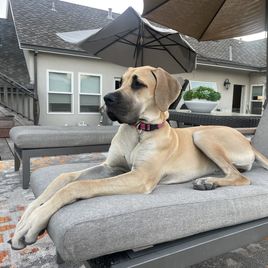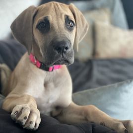 Brittany was great, easy to talk to and knew a lot about the breed to answer all questions we had. She had so many great puppies to choose from, but we sparked to one in particular who stole our hearts. "Nitro" has a great disposition, friendly, funny, and sticks to our sides like a glue stick! I encourage others to check out her website and her puppies if you want a fantastic Dane!