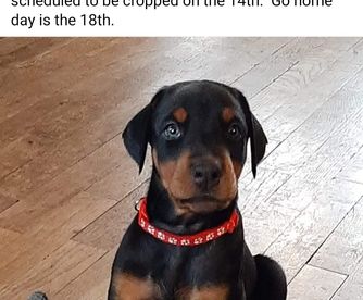 “Price includes ear crop, tail docked, shots, AKC limited registration, pet insurance, micro chipped and lifetime breeder support. All puppies are the same price regardless of color or sex.”