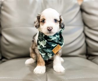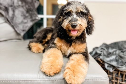 Our Bernedoodle puppies include tri-color, phantom, blue merle, and merle. Aussiedoodle puppies include sable, blue merle, red merle, black phantom, black tri-color, red phantom, and red tri-color. Colors will vary depending on the parent dogs.