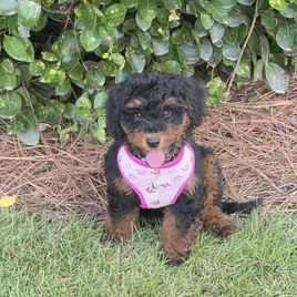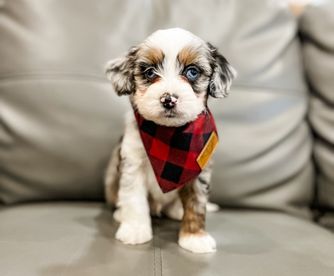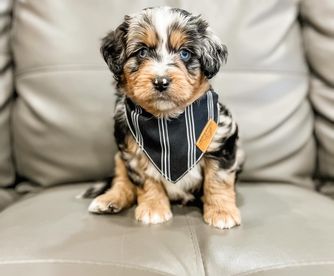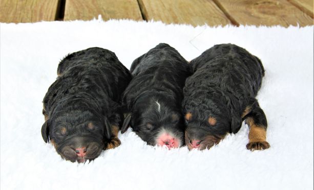 Our Bernedoodle puppies include tiny and mini sizes. Aussiedoodle puppies include toy and mini sizes. Sizes will vary depending on the parent dogs.