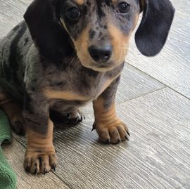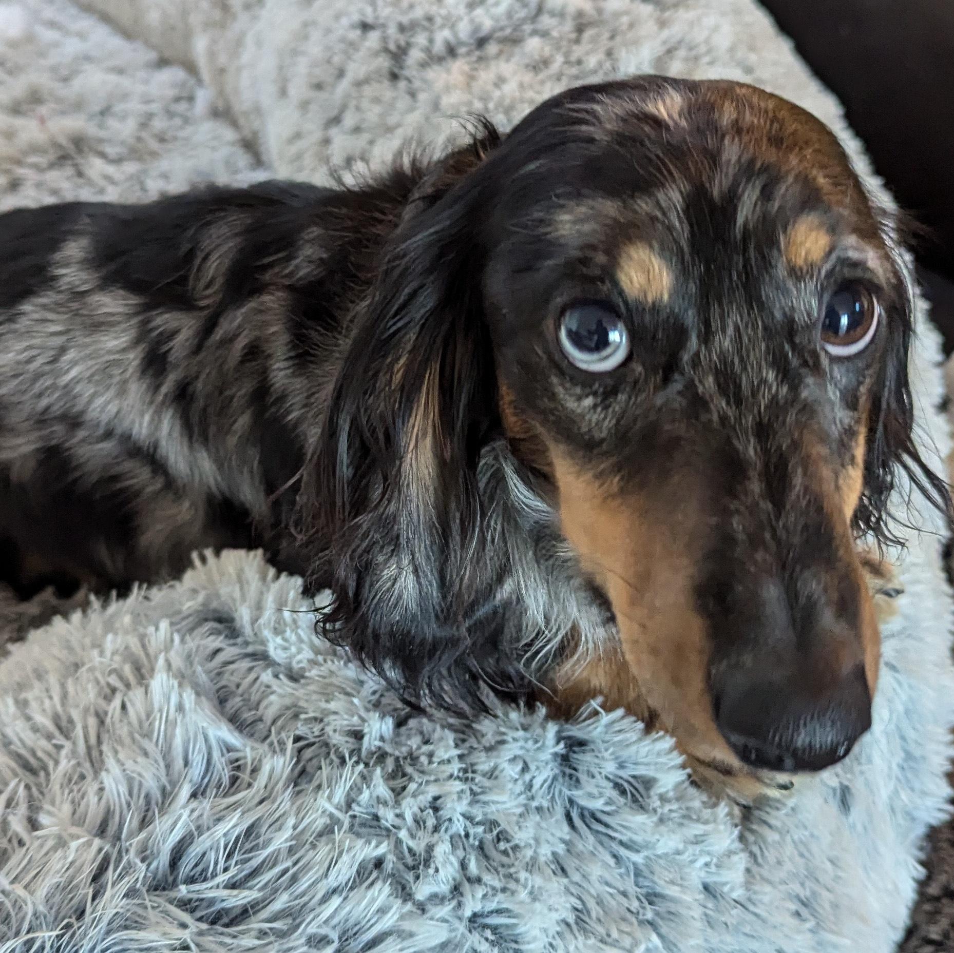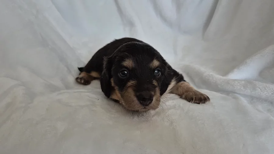 Nacho is an AKC, long haired, black and cream, dapple, mini dachshund. He is smart, friendly and very well trained.