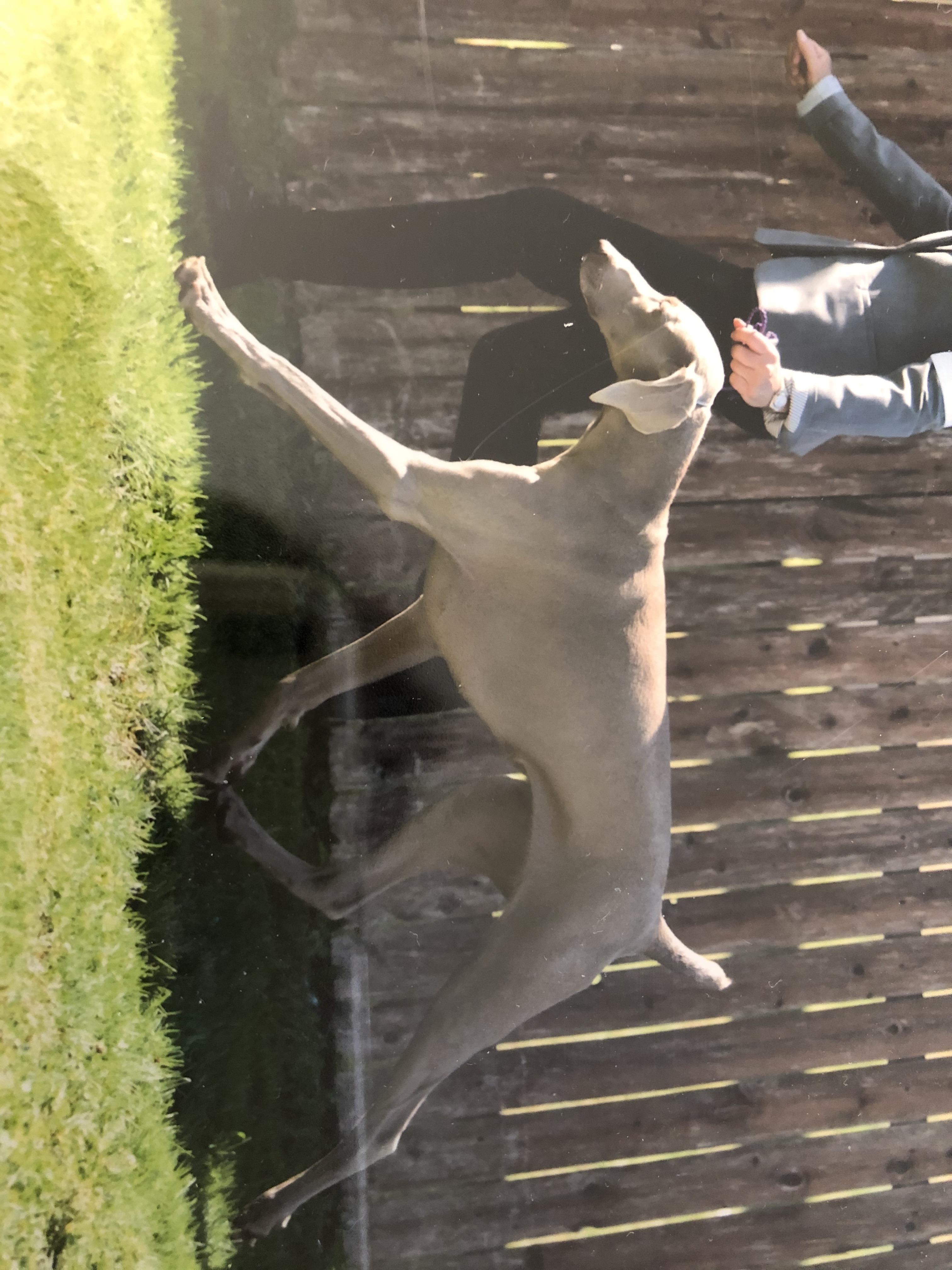 Years ago, I bred Minature Schnauzers. Loved the breed, but was looking for a different breed. I researched and found Weimaraners to be what I was looking for. We acquired our first Weimaraner (no papers) and loved her! When we decided on getting another, I had decided I wanted to show and found a wonderful breeder. I was able to get a Grand Champion title on this girl (Winnie), then decided I wanted to breed her, in hopes of keeping a puppy. That is what I did, and we have Rita, who also has a GCH title, but also some other titles including, Junior Hunt, beginner Agility, Temperament testing, DCAT title (FastCAT), and Farm Dog.