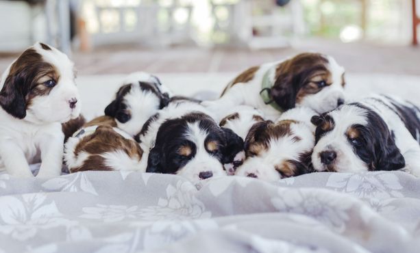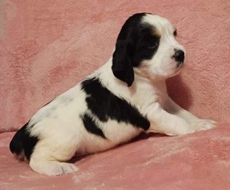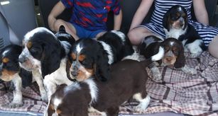 Our puppies include red and white, liver white and tan, black white and tan, and black and white. Colors will vary depending on the parent dogs.