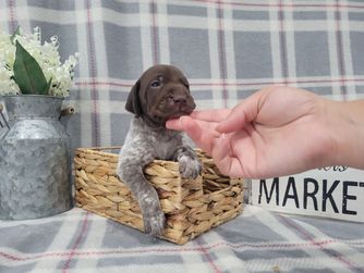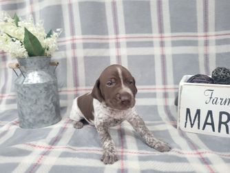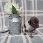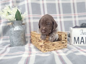 Our puppies include liver roan and liver and white. Colors will vary depending on the parent dogs.