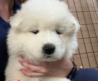 Octavia is a female Samoyed. Carefully selected as a great representative of her breed, Kelly decided to make her part of their program. Kelly has passed Good Dog’s screening process, which involved a review of their breeding practices, environment, and the mental and physical health of their dogs.