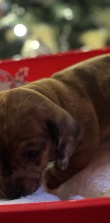 Our Dachshund puppies include red, chocolate, black and tan, and dapple. Colors will vary depending on the parent dogs.