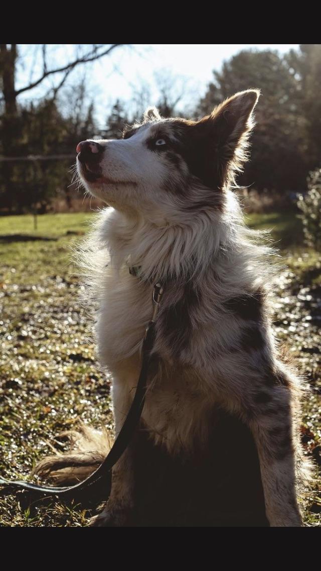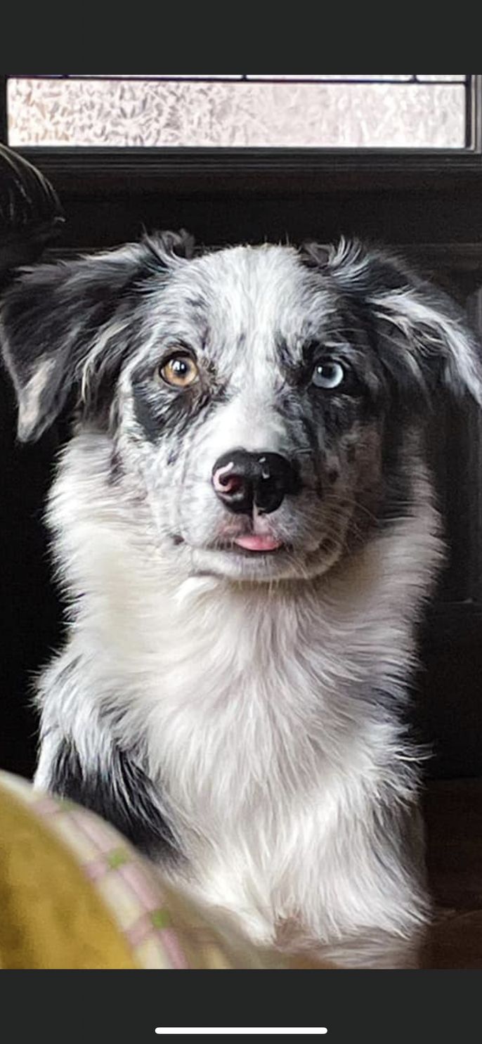 Blue is an overly friendly, very sweet, lower drive Border Collie with striking blue eyes and a shaggy rough coat! He steals the heart of anyone that comes to our farm. We call him the ‘farm greeter’.