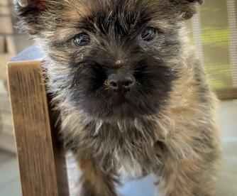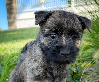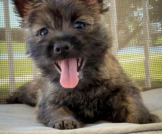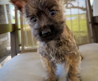 Cher is a stunning gray-brindle Cairn Terrier with a sweet, nurturing side that shines in everything she does! True to her breed, Cher is spirited and intelligent, with a keen curiosity for the world around her. While she loves a good adventure, she also has a calm and affectionate demeanor, making her a wonderful companion. Cher is attentive and patient with her puppies, ensuring they grow up confident and well-socialized. Her strong Cairn instincts make her sharp and clever, and her loving nature ensures she’s always ready to cuddle up with her family!