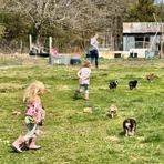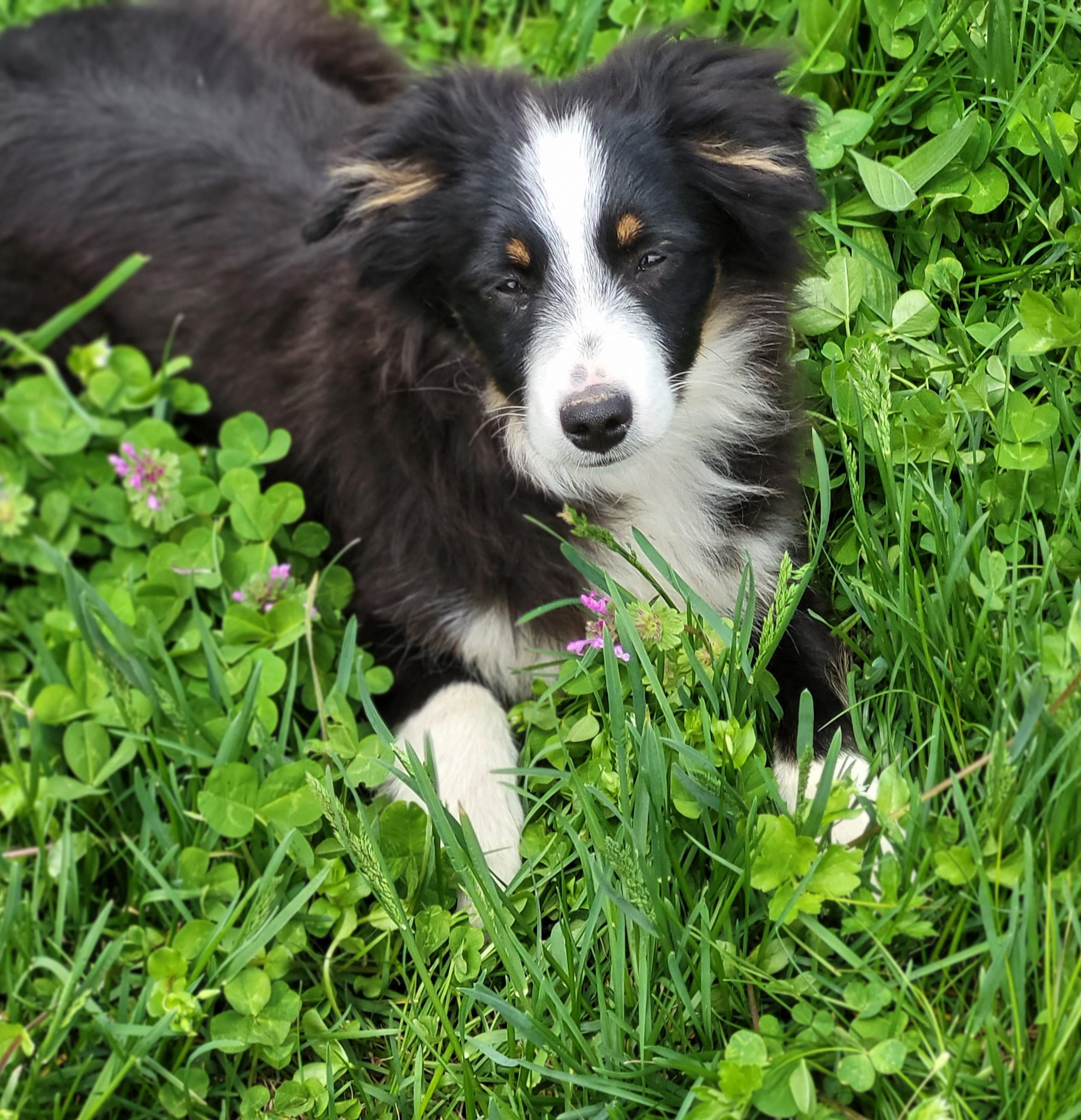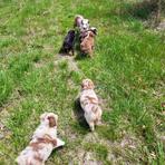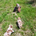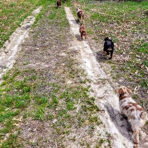 There are 6 left at home, and we had an adventure today out in the back field. They had a blast smelling all the things, running after mom, dad and the other uncle's and aunts. Afterward I took them to the vet for shots and came home for a bath a much needed bath. Clover and Mae slept by my feet for a while and the boys I think had enough of me messing with them so they went to the sunroom to sleep in their crates. Through out this last week we've had friends and their kids over to socialize the pups, a lot of playing in the garden, and in the house underfoot potty training as much as possible. They go through the night with no poop accidents and occasionally a pee accident. Recall is good and individual names are starting to really get their attention.
