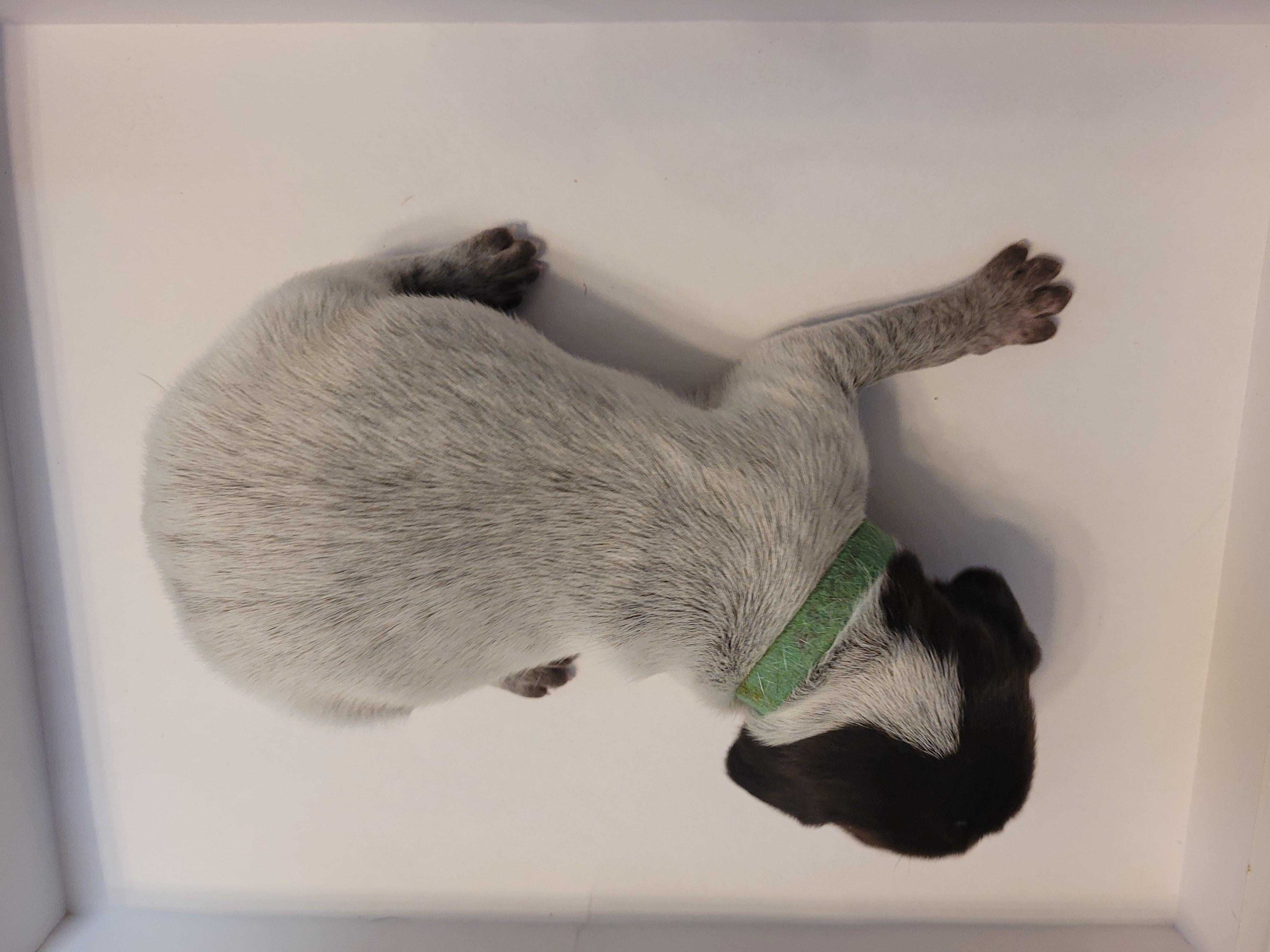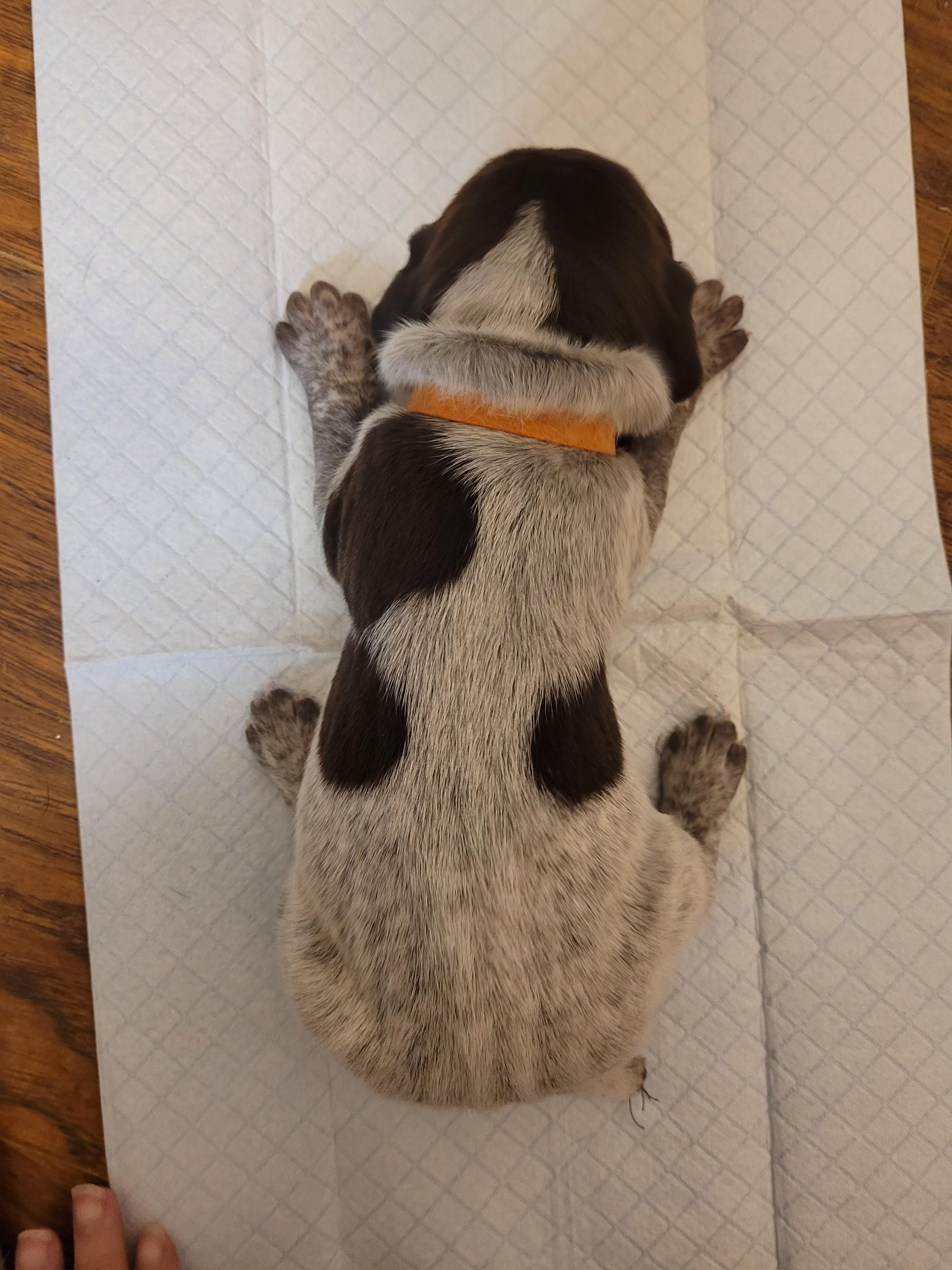 Our puppies include liver roan, white and liver, and liver. Colors will vary depending on the parent dogs.
