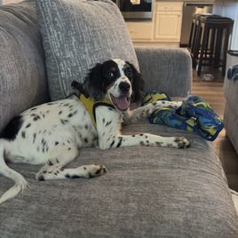 Mj is a female English Springer Spaniel. Carefully selected as a great representative of her breed, Nate decided to make her part of their program. Nate has passed Good Dog’s screening process, which involved a review of their breeding practices, environment, and the mental and physical health of their dogs.