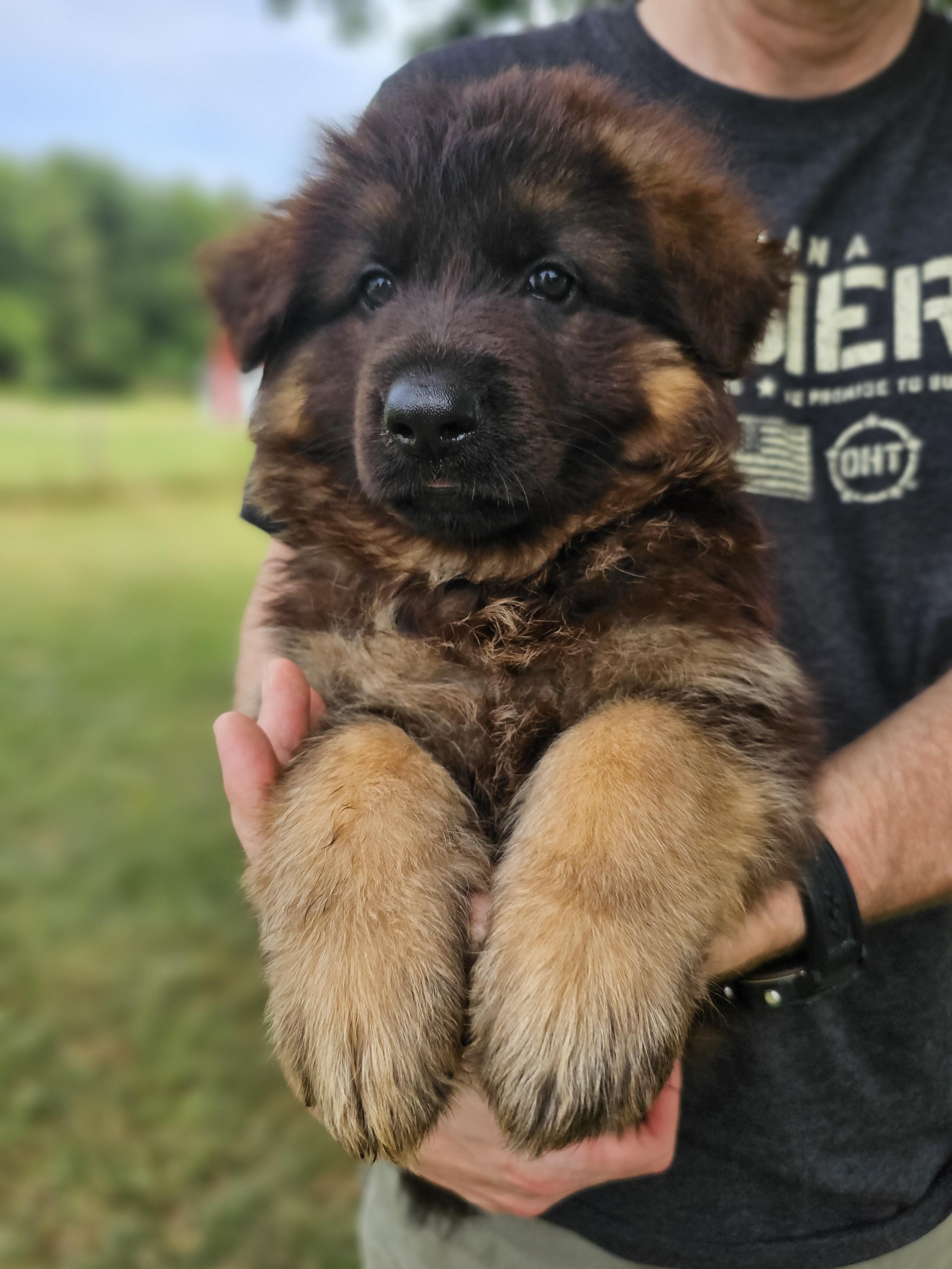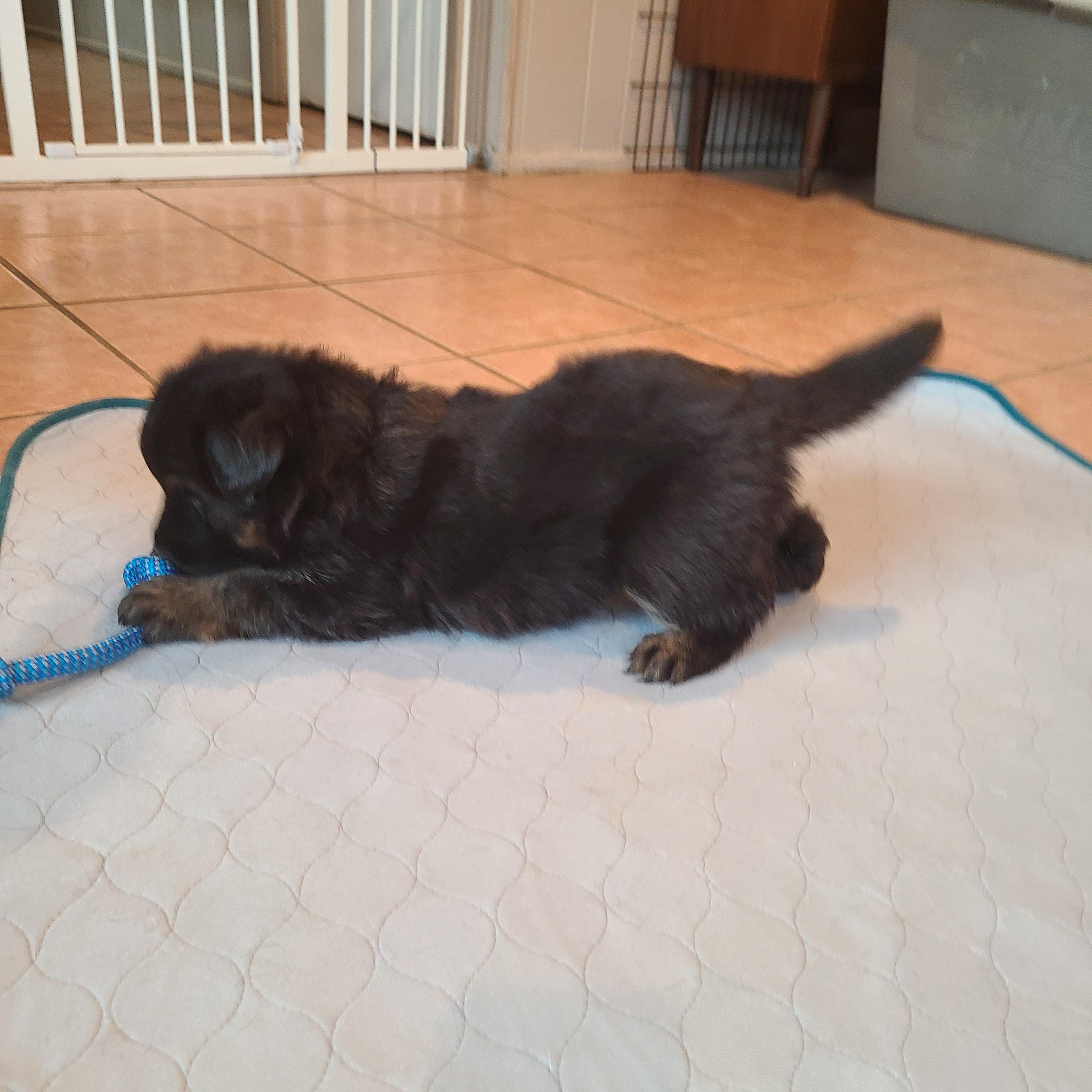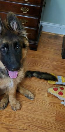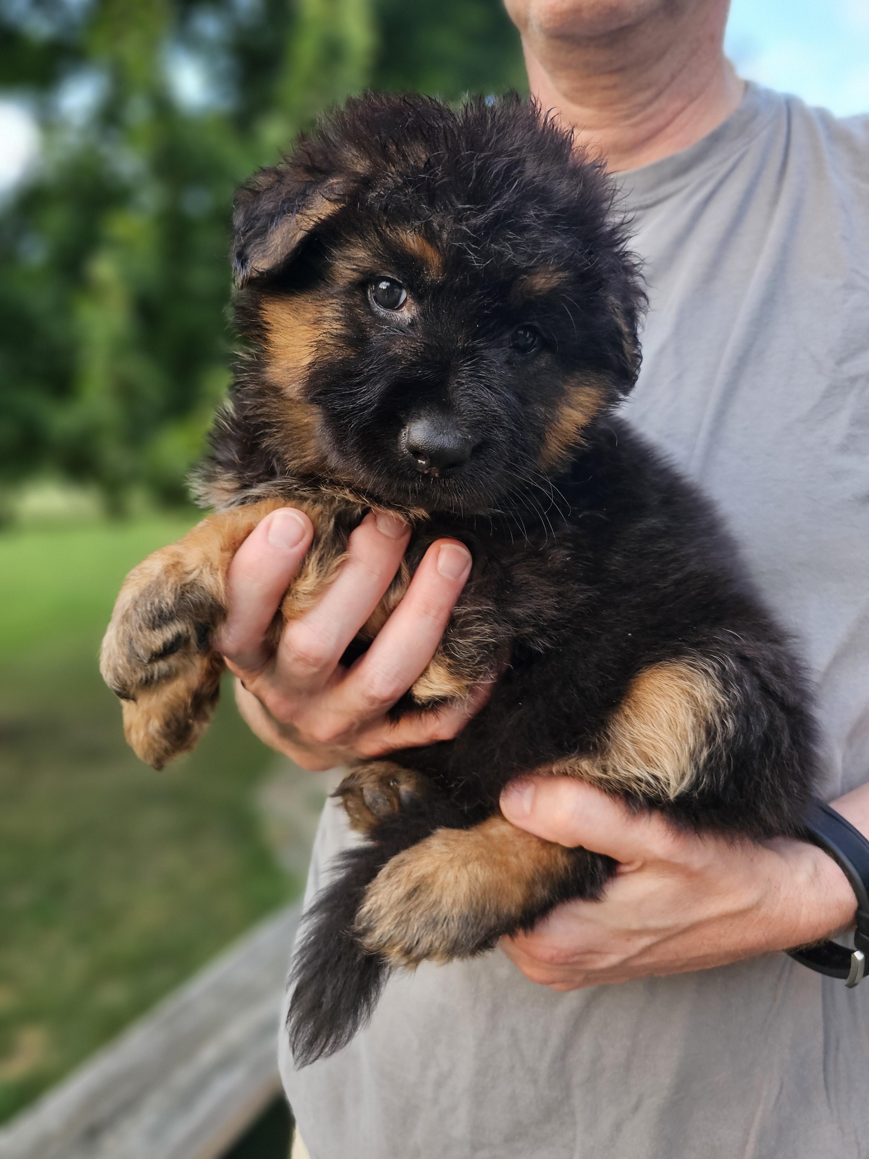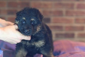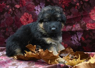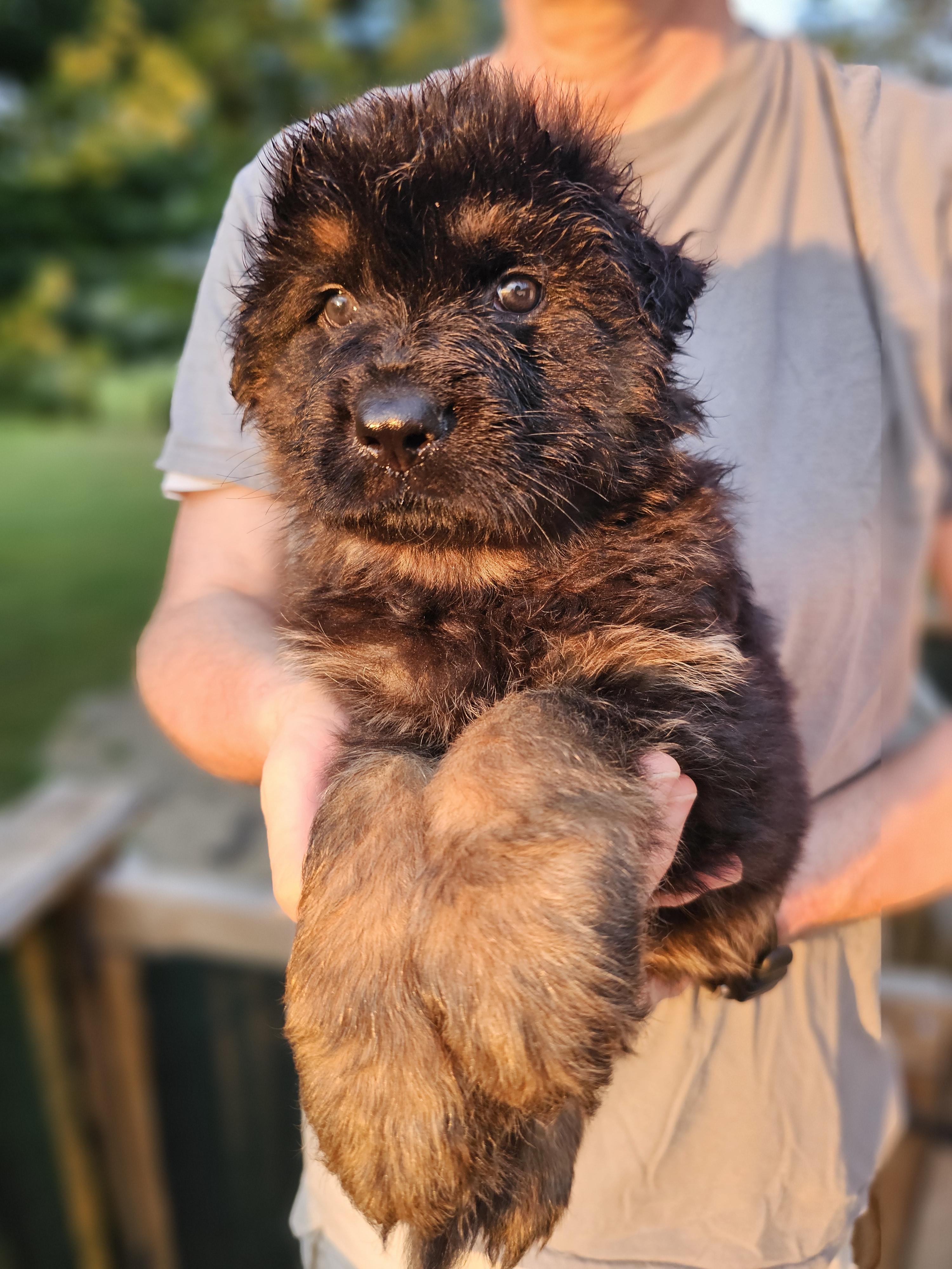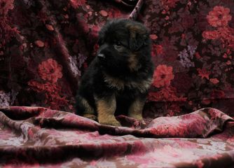 Aurora is a beautiful black and red longcoat. She is always willing to try new things and has been a delight to train. She loves to play fetch, take long walks or just to hang out with you. She is the epitome of the AKC GSD standard. Aurora has many titles in her pedigree and is currently working on her own titles. Aurora is embarked tested clear, dm clear with SV rated hips A normal, elbows normal.