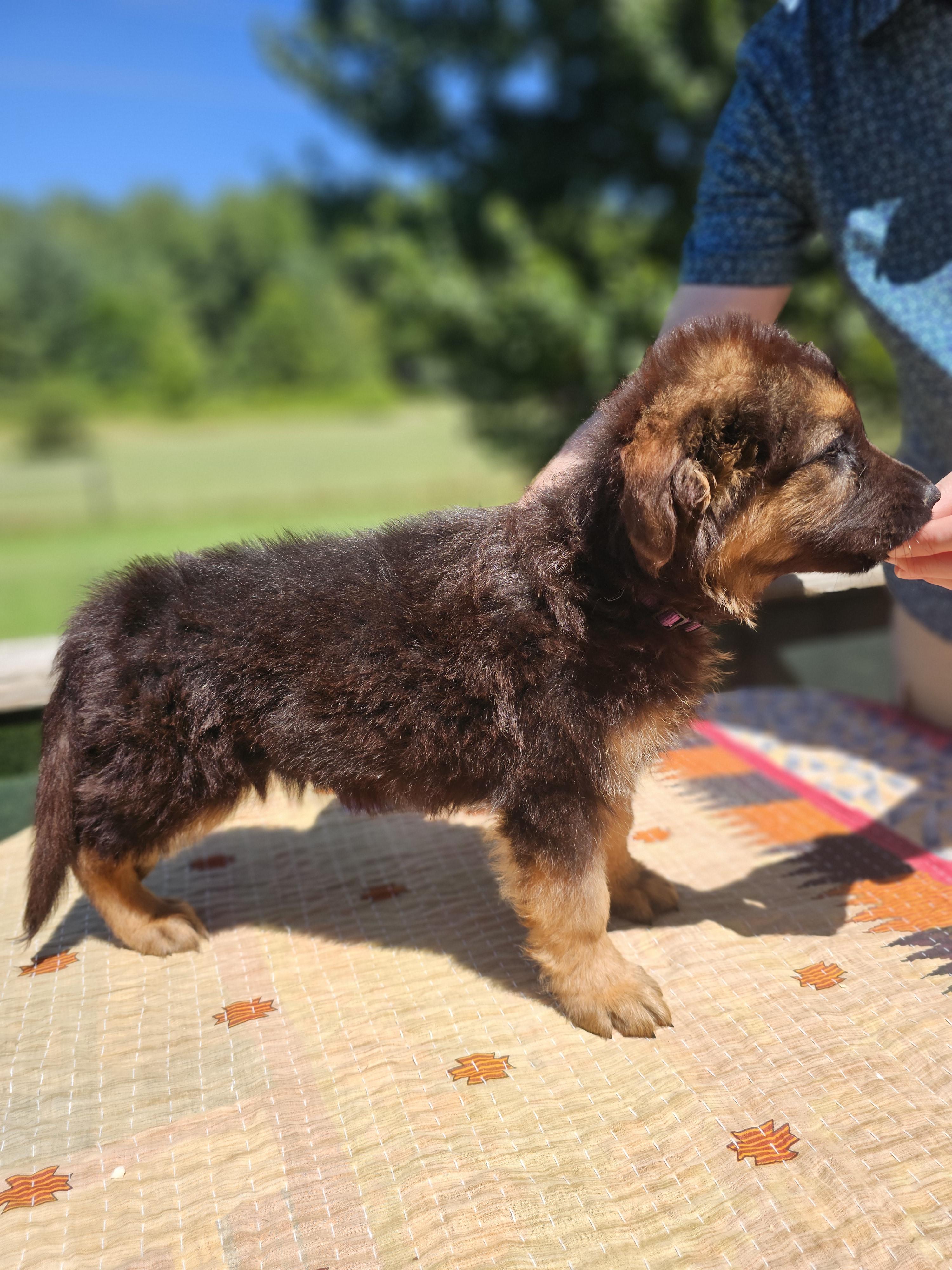 Polina is a true longcoat bi-color. We imported her from the Ukraine as a puppy. Polina is gentle and loving. She is a care taker, she loves people above all else. We expect puppies from Polina to be service dog, therapy prospects. Even though gentle, she still loves a good game of fetch and has an amazing sniffer. She also loves to hike but not too far. :)