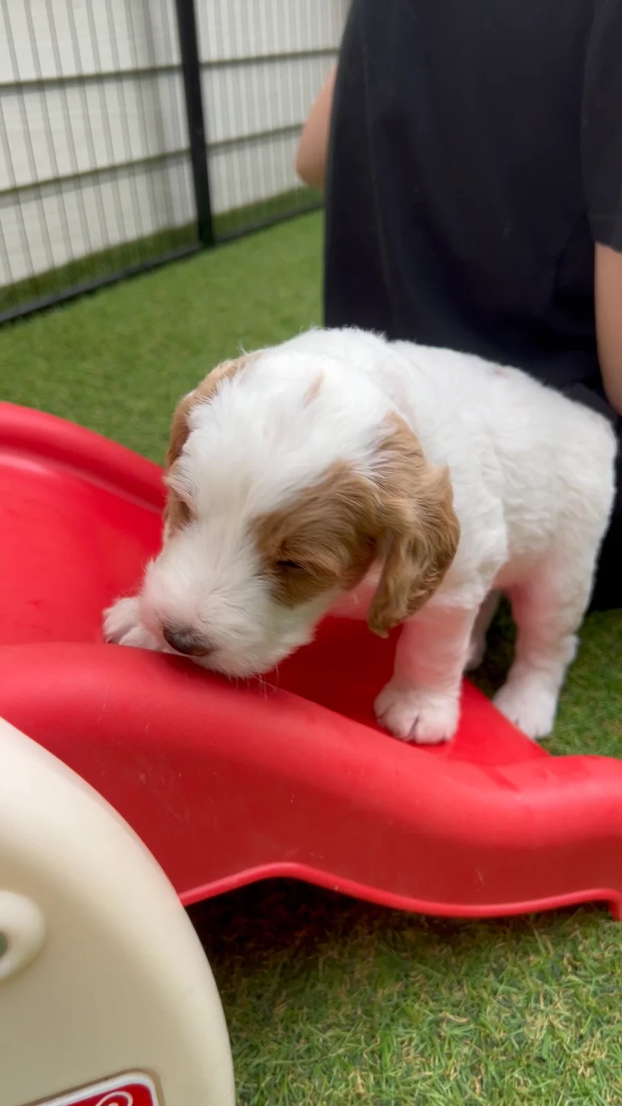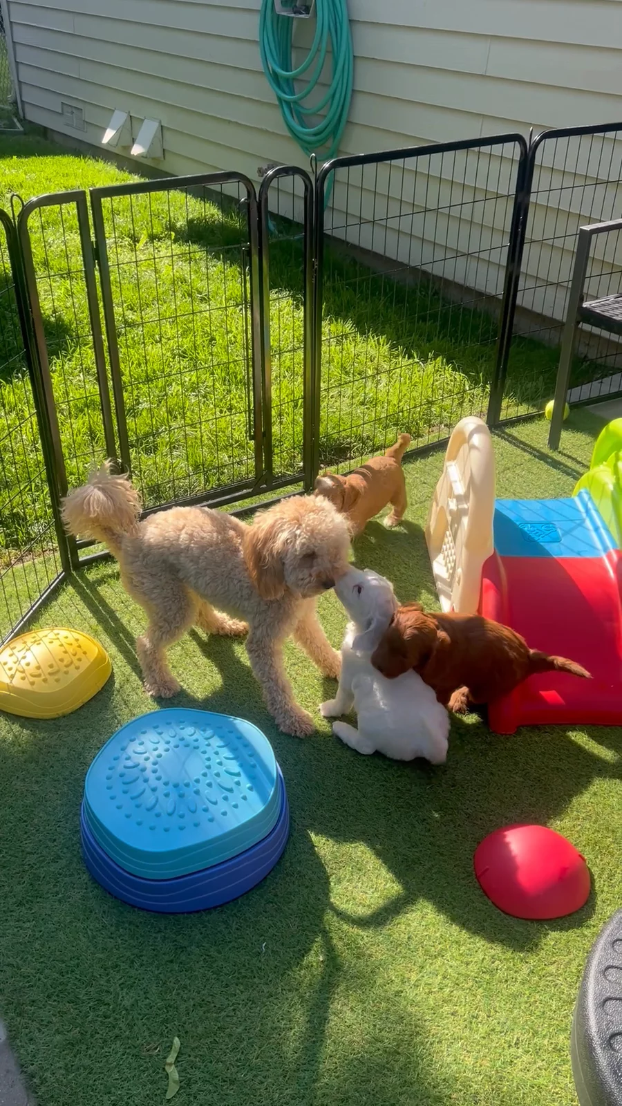 Pups are now playing outside! Ziti was being brave and checking out the slide.