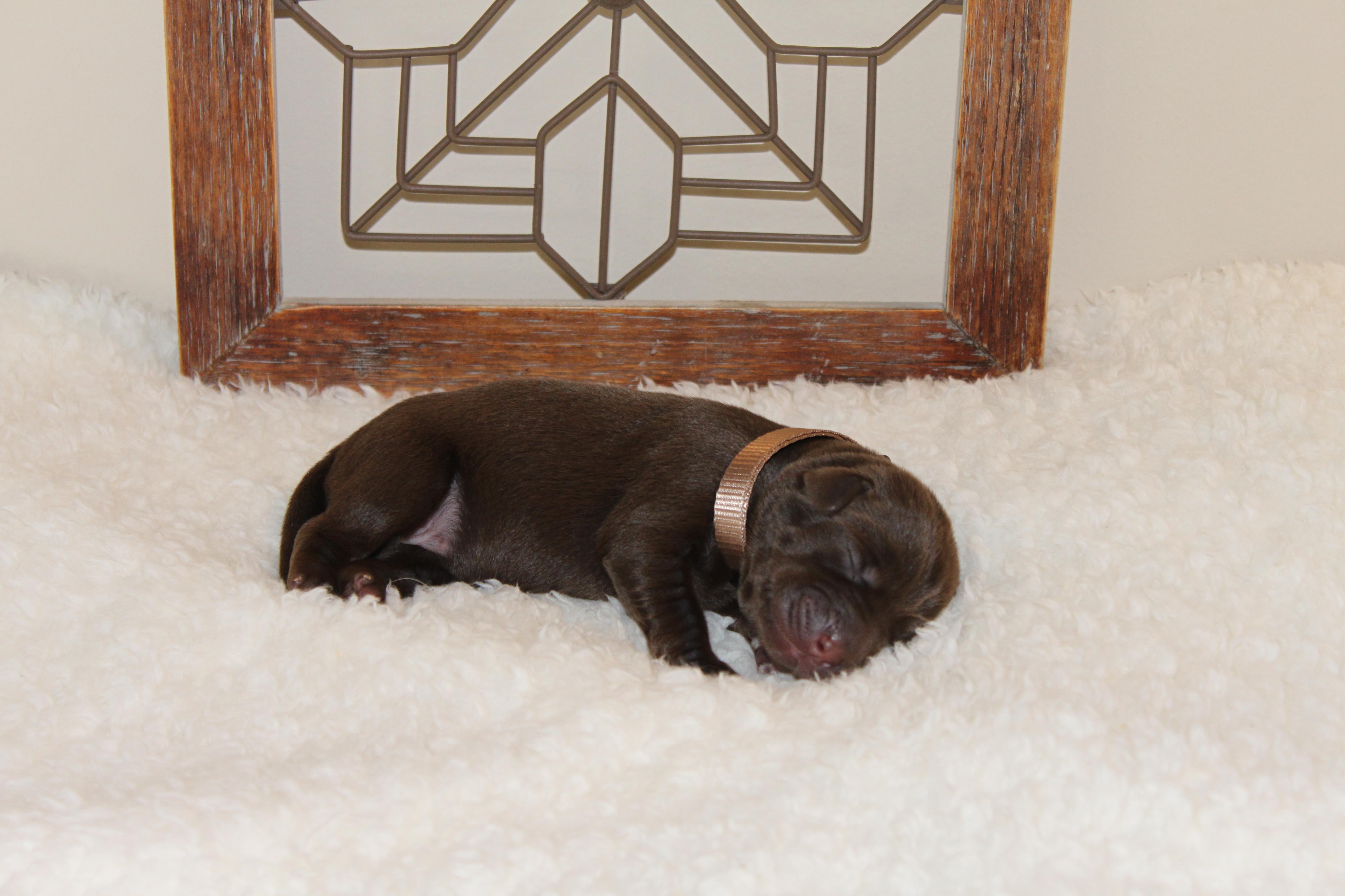 Our puppies are chocolate. Colors will vary depending on the parent dogs.
