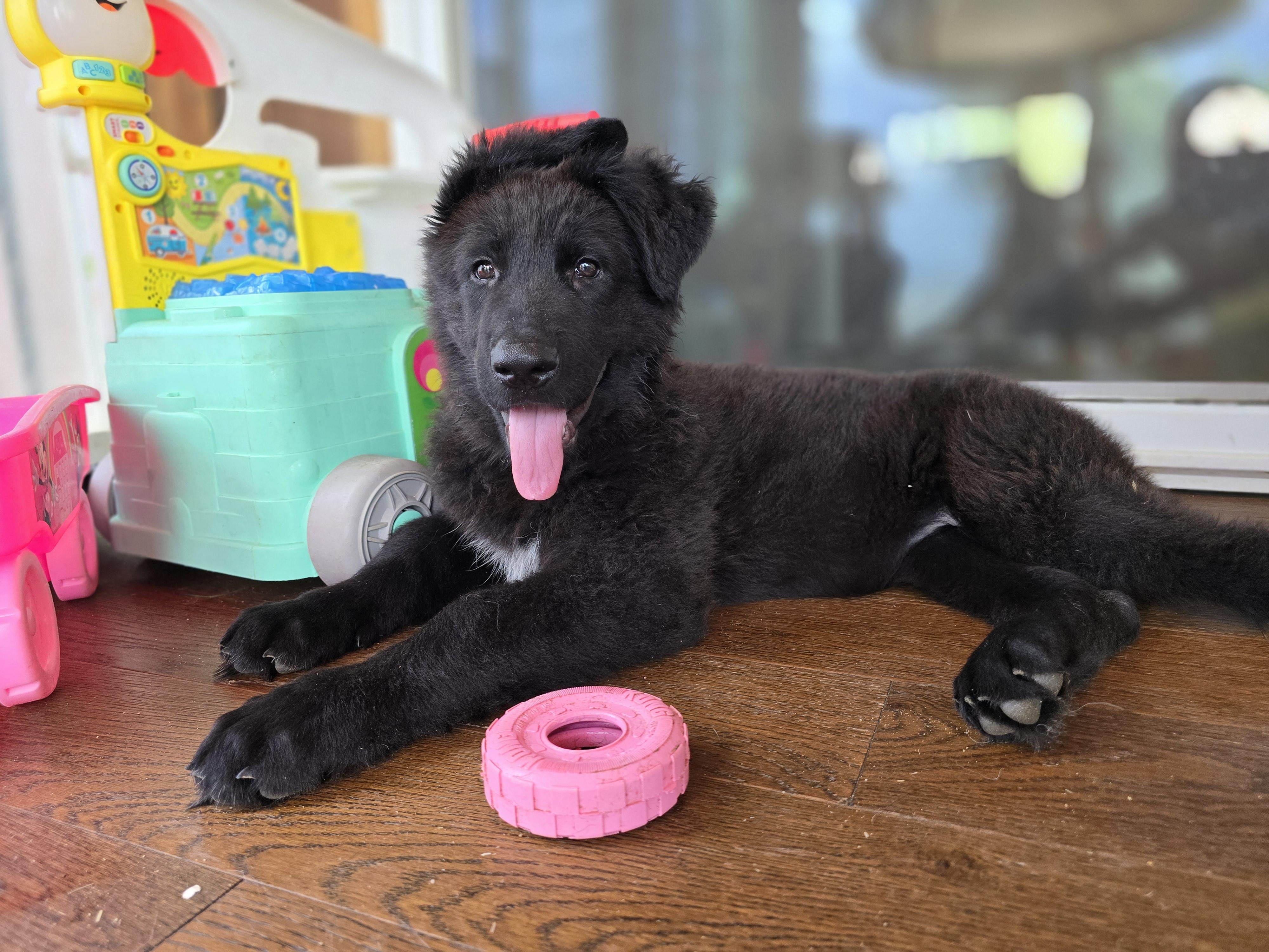 Our puppies include white, black and silver, black, and black and cream. Colors will vary depending on the parent dogs.