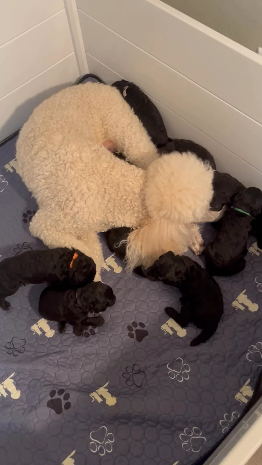 I love watching the pups with Riesling on the web cam in the evenings when they are having special time together and the pups are getting filled up to sleep for the night. In the next few days we plan to move the pups to their new, larger xpen, with a sleeping area, potty area, and eating/play and learning area. We will also begin offering puppy mash and water to the pups who are ready for this next period of growth. The pups enjoy being held and having their ears rubbed ❤️