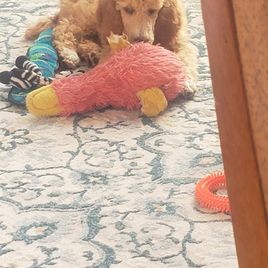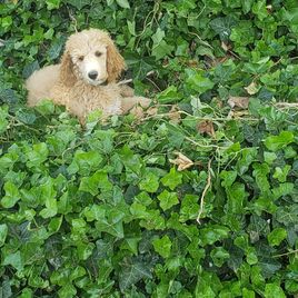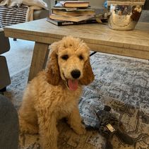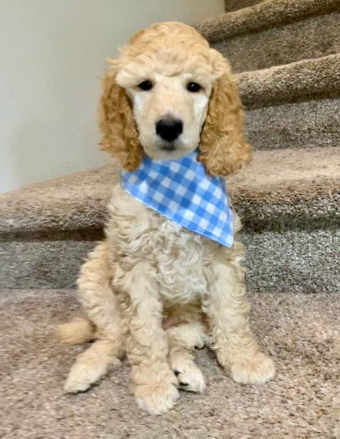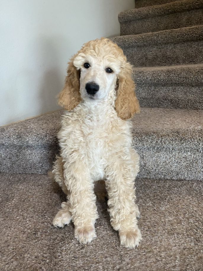 Extremely calm, very in tune with human feelings. Beautiful medium-sized Standard with a natural service and therapy personality. Stunning cream coloring. Health tested with Embark and clear/normal across the genetic panel. She was our pick of the litter. Chosen for her person-centric and calm demeanor.