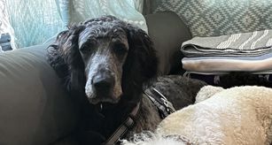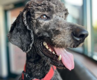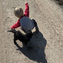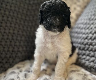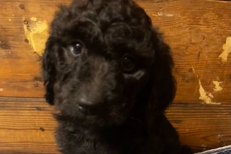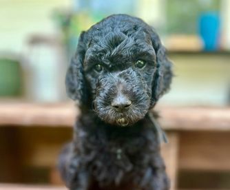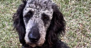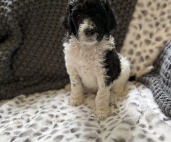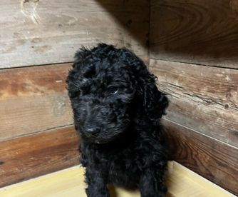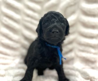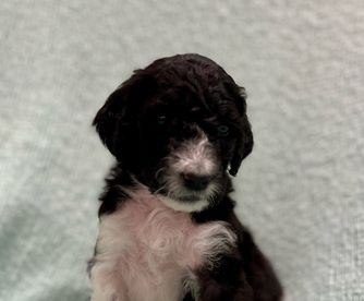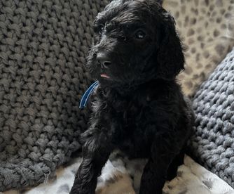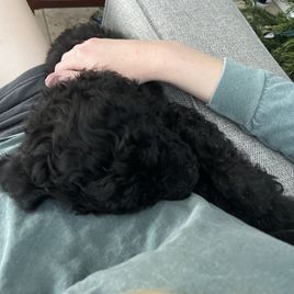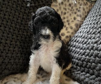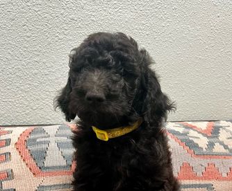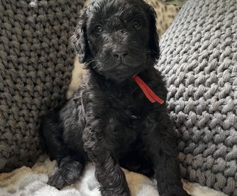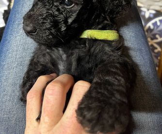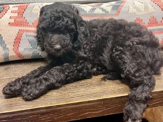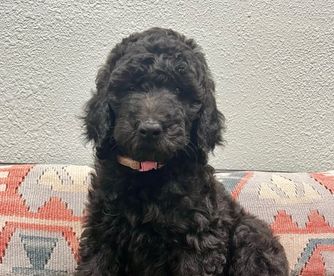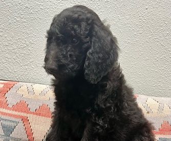 Goofy, intelligent, loving boy who has become a wonderful fetcher. He is easy to train, eager to please, is very loyal to his pack, and loves Mom best. He is wonderful with the kids. He has never growled or bit any of our children or children who visit. He was originally solid black, then started top develop his gray "chaps" and mask around 8 weeks old. He is curly most everywhere with a straight haired chest.