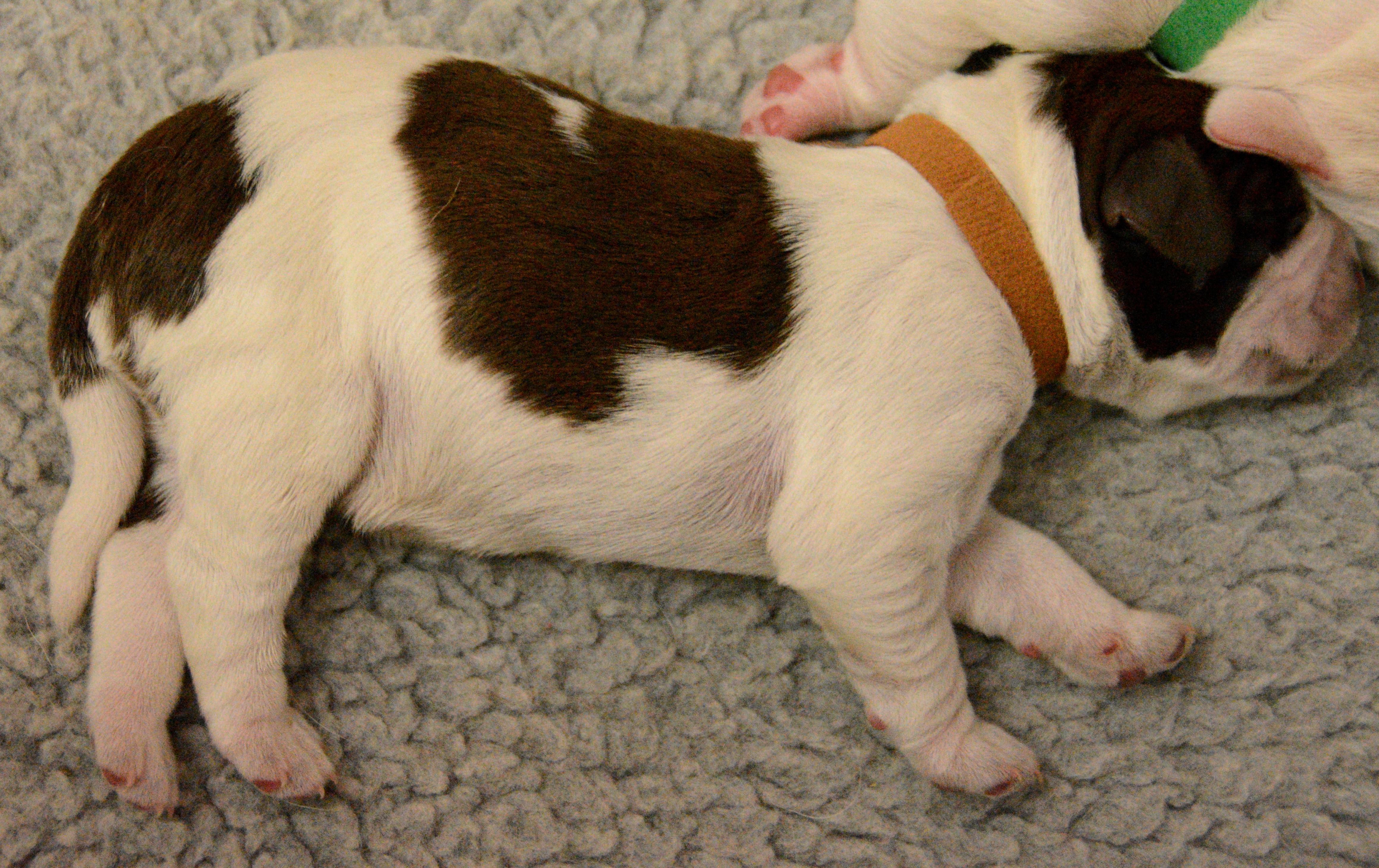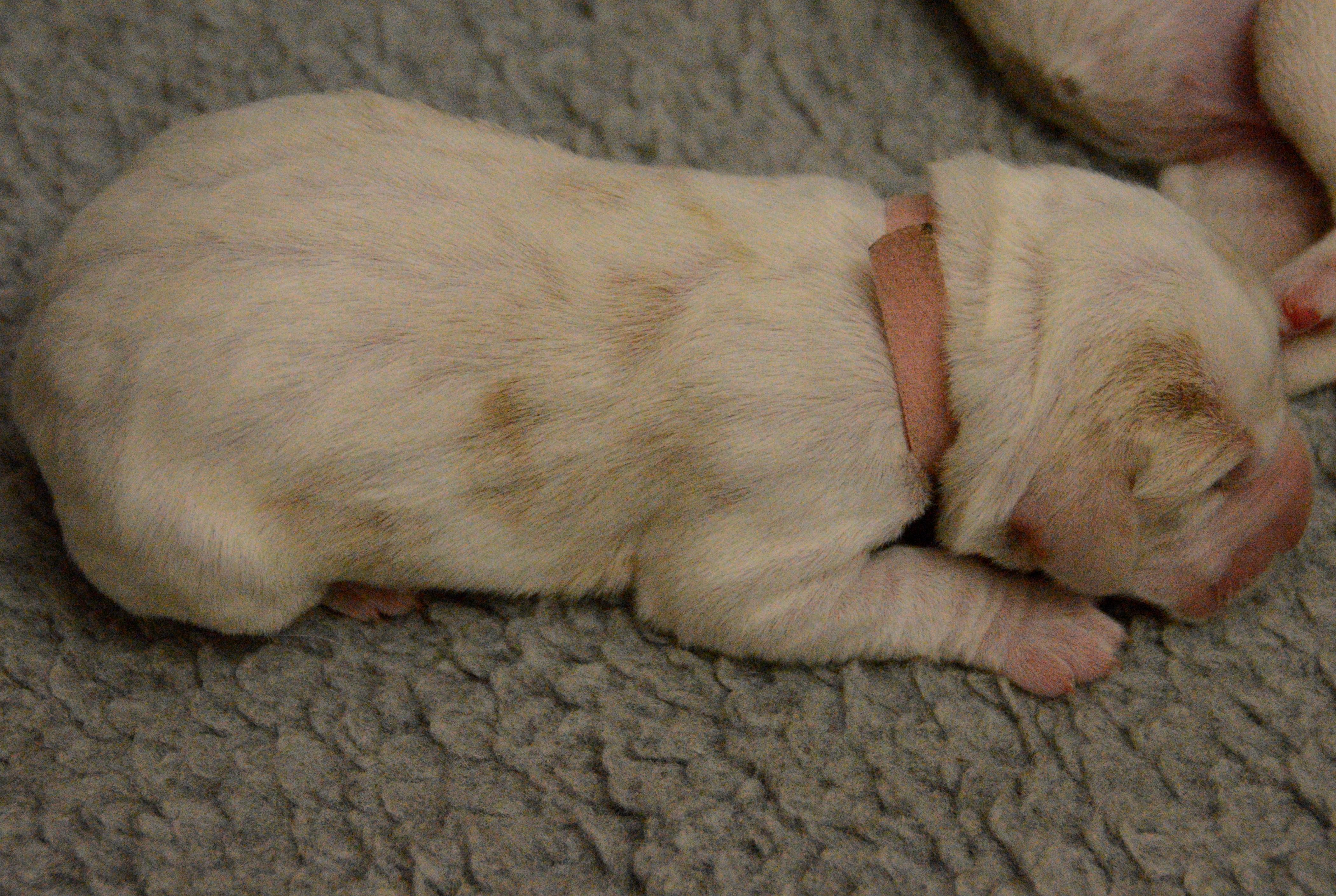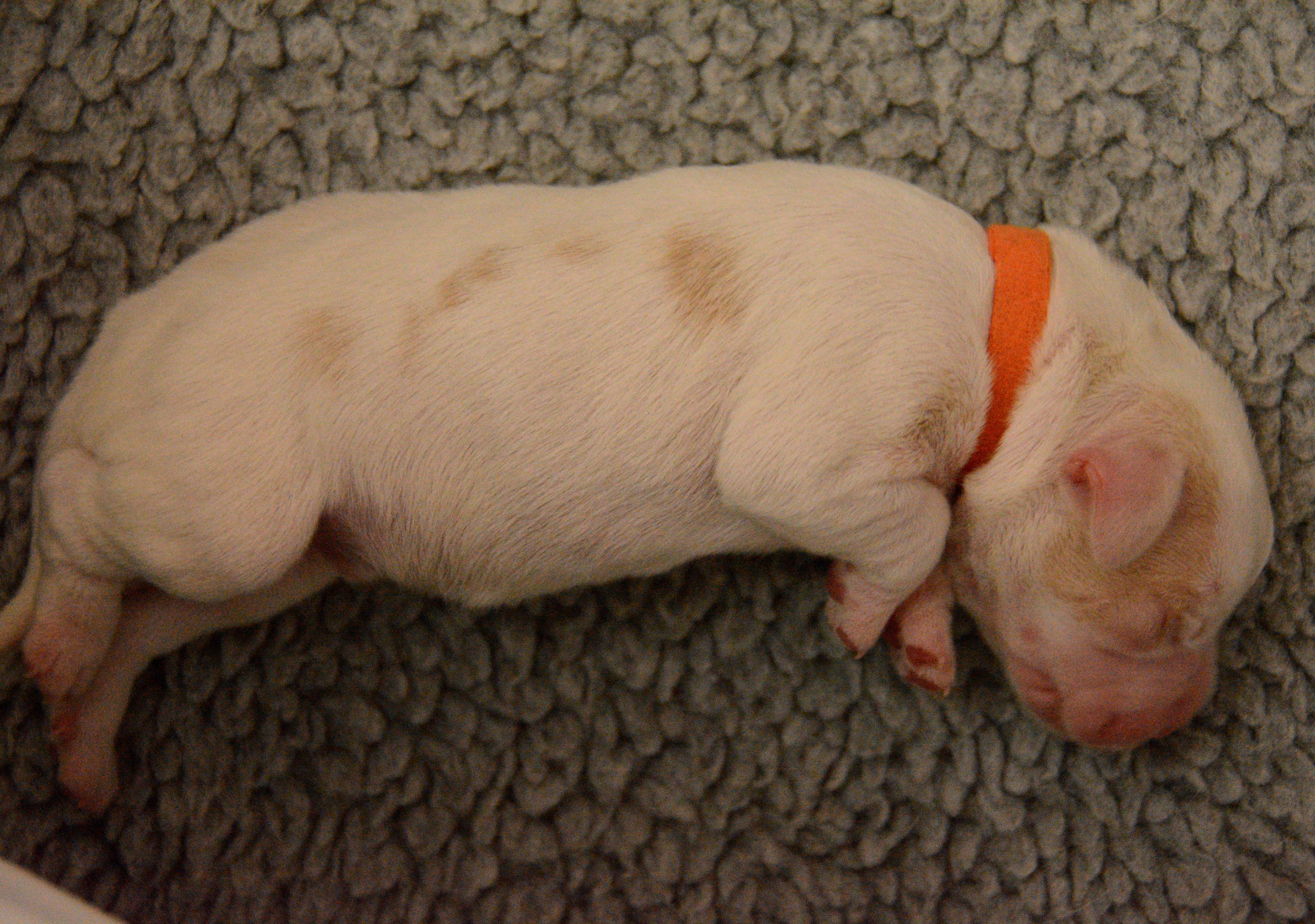 Our puppies include white and orange, orange roan, and brown roan. Colors will vary depending on the parent dogs.