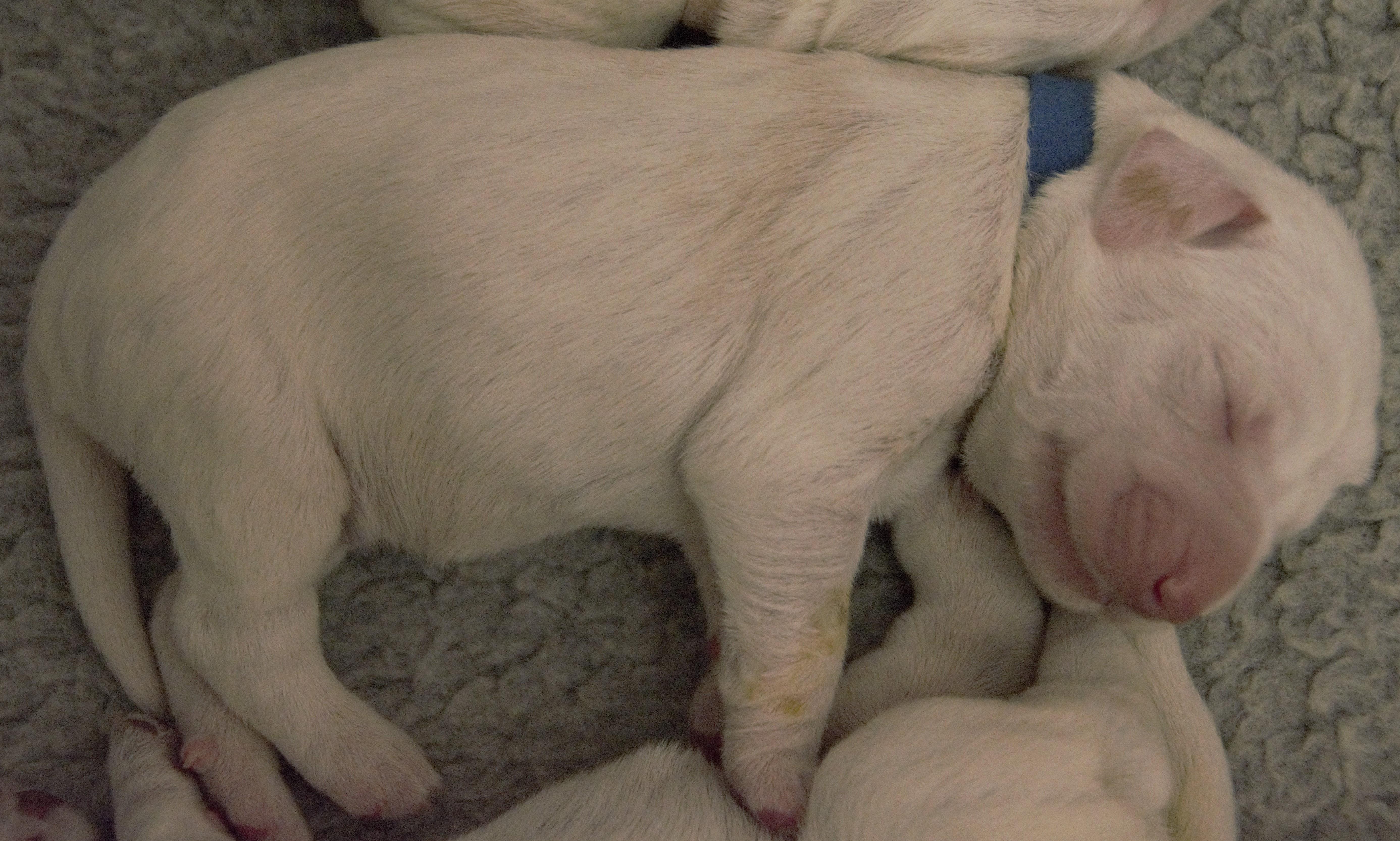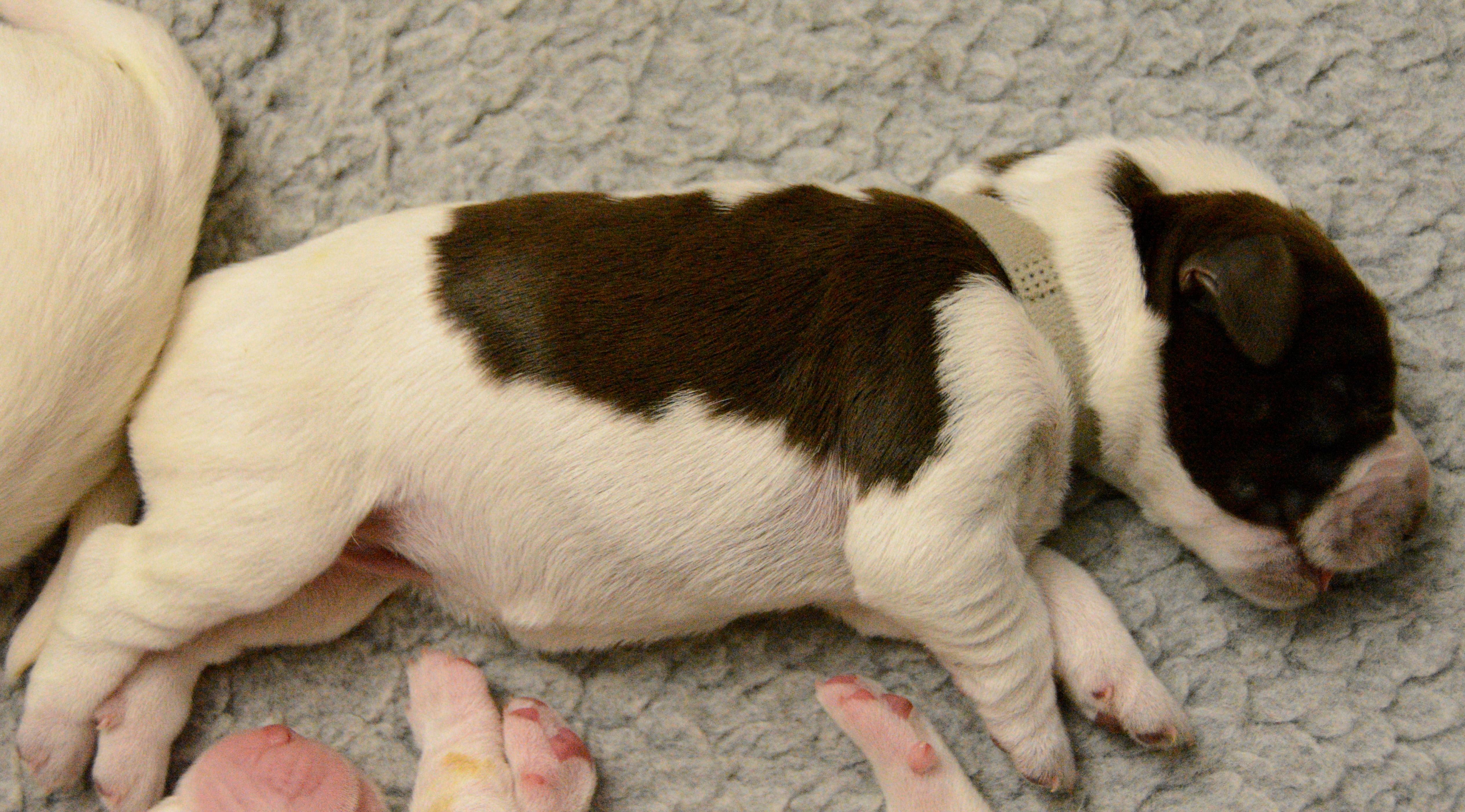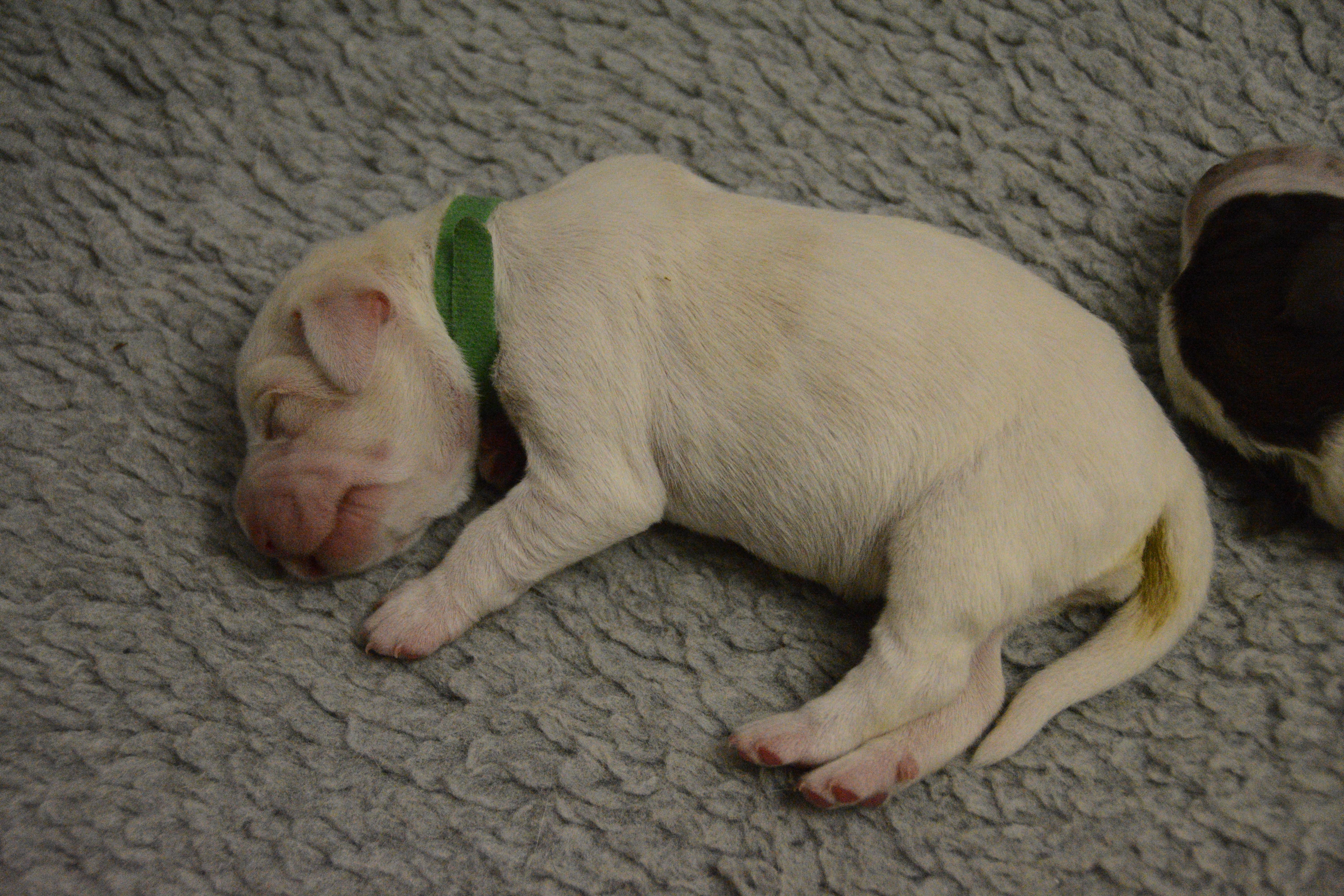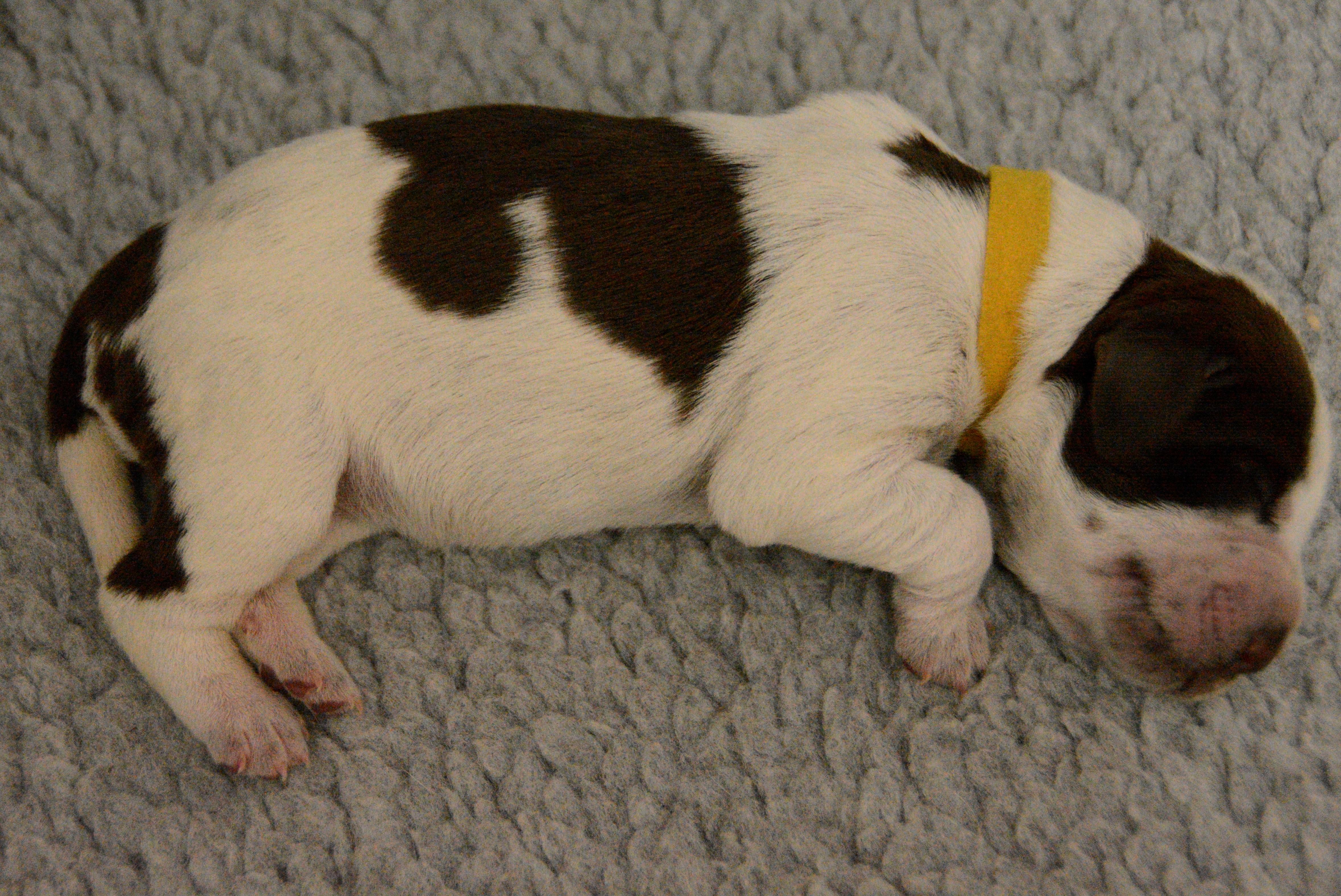 Our puppies include white and orange, orange roan, and brown roan. Colors will vary depending on the parent dogs.