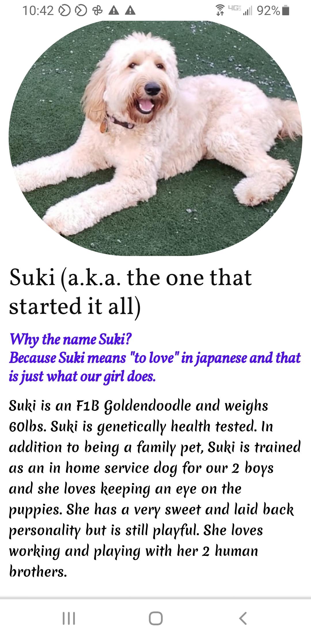 Sukisdoodle's story starts with our precious Goldendoodle girl, Suki. We welcomed her into our loving home in 2018 for service work. She is very dedicated to her job and gentle in nature! The joy that Suki has brought us inspired us on our breeding adventure. We strive to raise Doodles that have the lovable temperament and trainability of Suki so that others may experience the same love that she has gifted us!