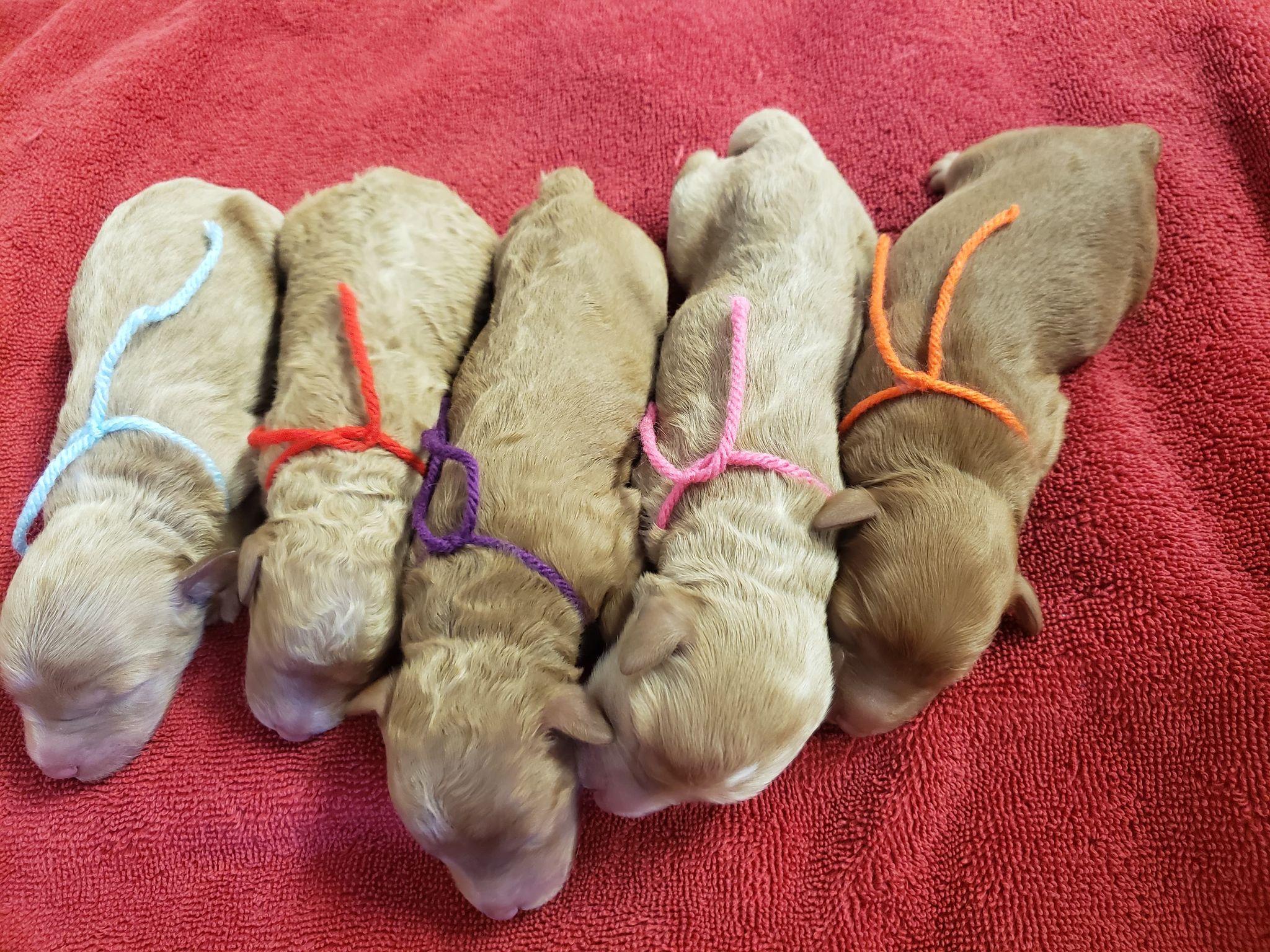 Goldendoodle puppies include cream and apricot. Colors will vary depending on the parent dogs.