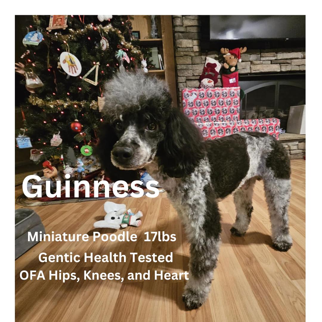 Guinness is a miniature tricolor poodle. Guinness lives here at Sukidoodles and loves all the action playing with the boys and the other dogs. He has never met a stranger. He loves everyone, especially if you want to play fetch!