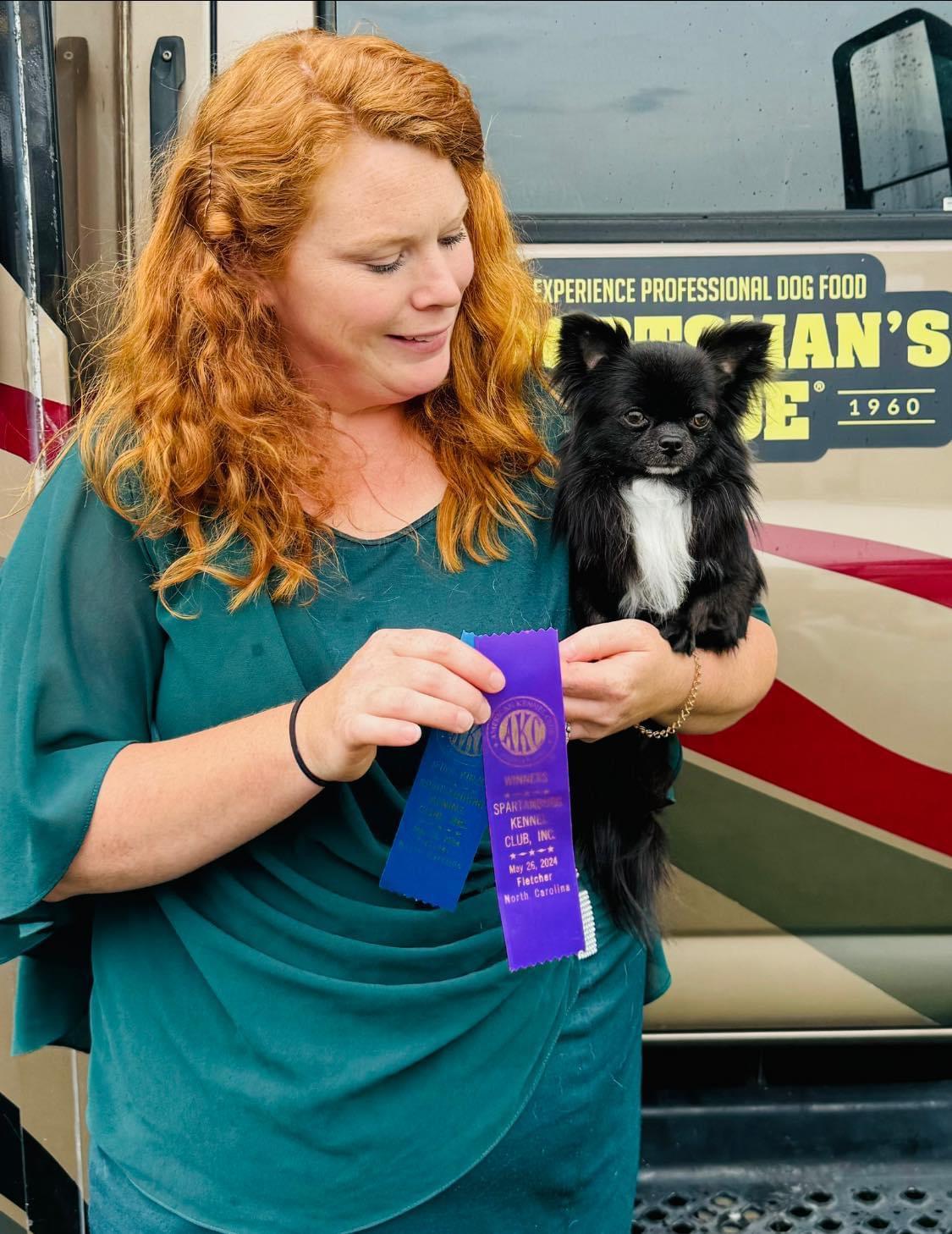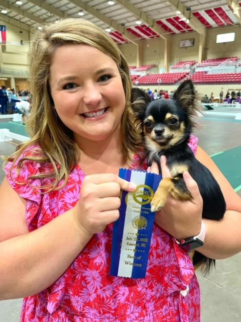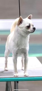 Issac was recently awarded Best of Opposite Sex to the Best of Variety at the Central Carolina Chihuahua Specialty. He is currently ranked number 7 long coat chihuahua in the nation as announced by Canine Chronicle. He is an American Kennel Club Silver Grand Champion. When it comes to having a watch me personality and a stunning face he is your guy. Issac enjoys spending time with his family hanging out of the sofia while we watch tv, floating on a raft in the swimming pool, and running and playing in the yard.